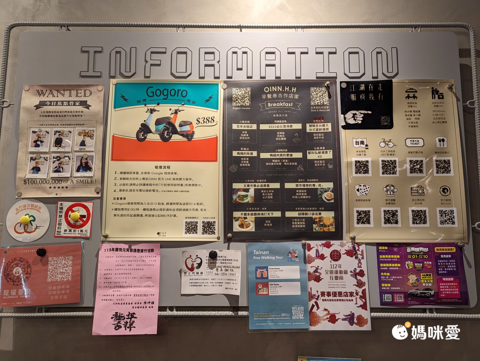 櫃檯旁邊的公布欄,有很多台南旅遊的實用資訊,包括早餐券配合的店家!趕快先拍下來慢慢研究