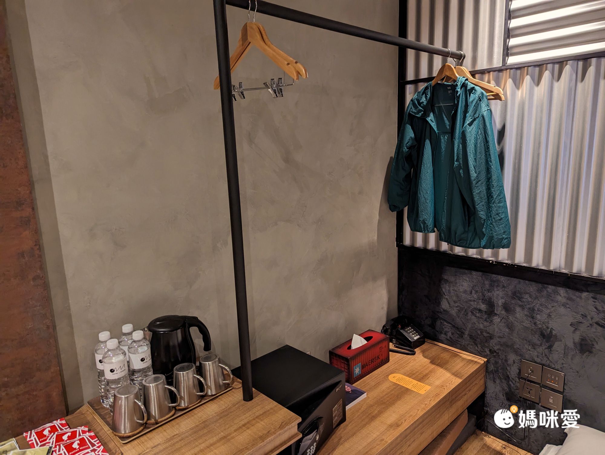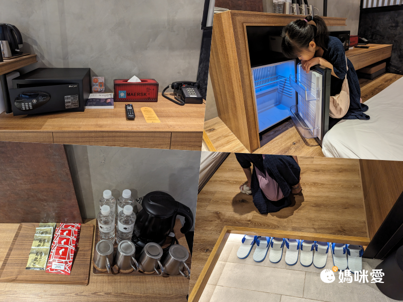 房間的擺設是很清爽的都市風格,該有的配備一樣都不少!桌面底下有冰箱及除濕機,床邊還有簡潔美觀的開放式衣架,還附了許多茶包跟咖啡給我們覺得非常感謝,都很好喝,在頂樓的公共空間也有免費提供!也有古早味的電話和保險箱~拖鞋也是很潮又很復古的藍白拖呢!(笑)