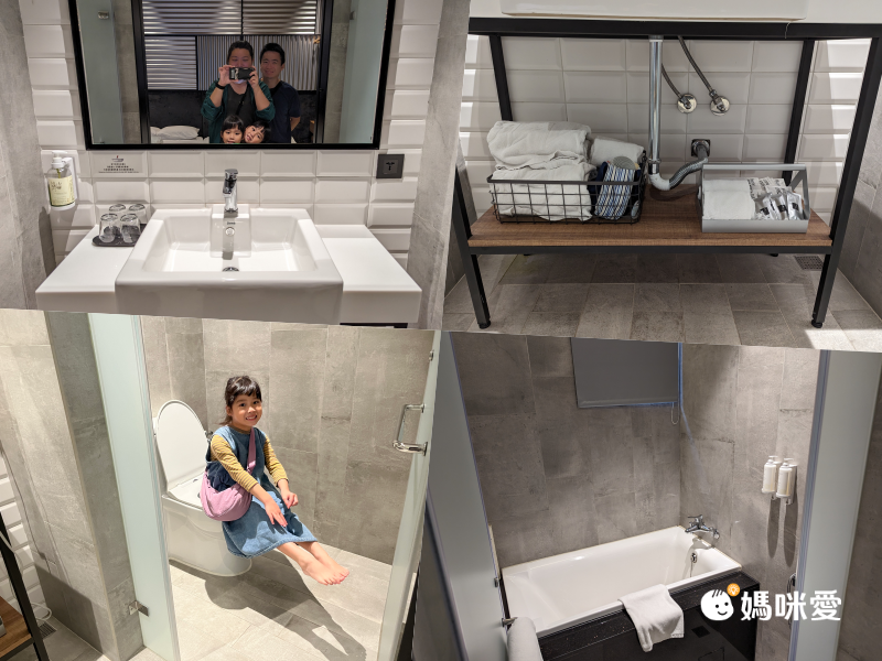 衛浴是乾濕分離的,中間的洗手區、左邊的浴室及右邊的廁所,都非常乾爽整潔!浴室有一個小浴缸,真是令人雀躍!洗手台下方有吹風機及浴巾、牙刷牙膏等備品,如有需要,飯店也提供嬰兒床與澡盆唷!