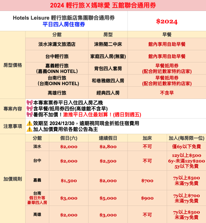 註:加人每房限一位,加價費用如下:淡水館僅開放6y以下免費入住;台中館12y以上$500,6y-未滿12y$200,5y以下免費;嘉義館7y以上$500,未滿7y免費;台南館7y以上$700,未滿7y免費;高雄館7y以上$500,未滿7y免費。(貼心提醒:能不能加人加床還是依訂房當下飯店的回覆為主喔~(有可能當下可訂房間空間較小,比較不適合加床/加人)