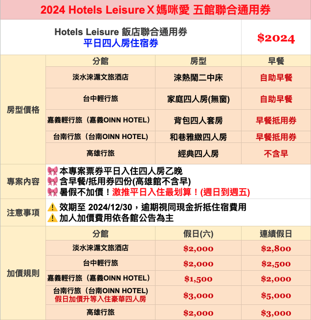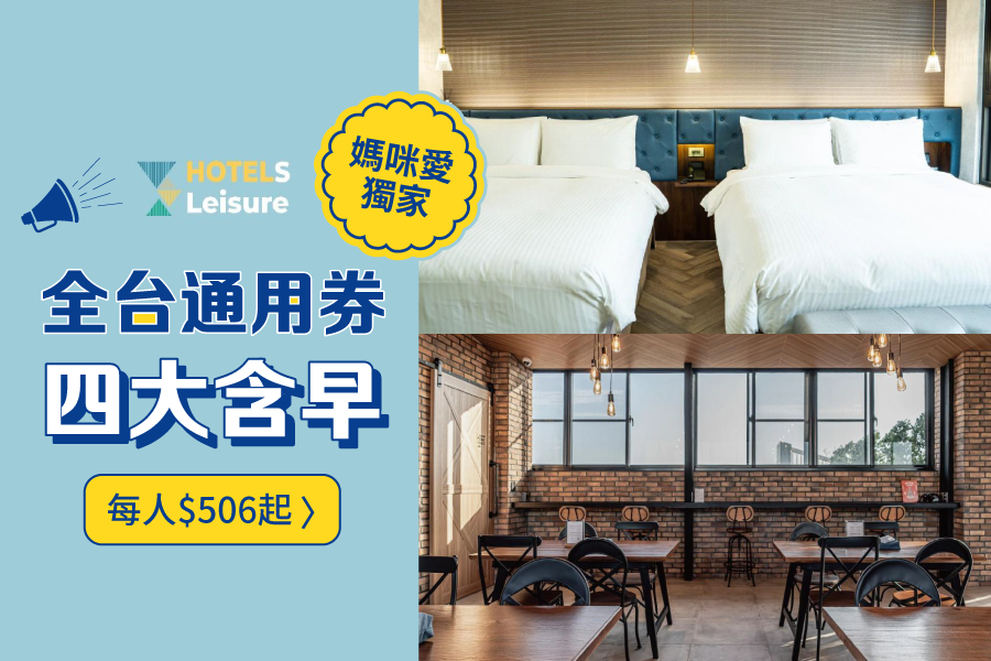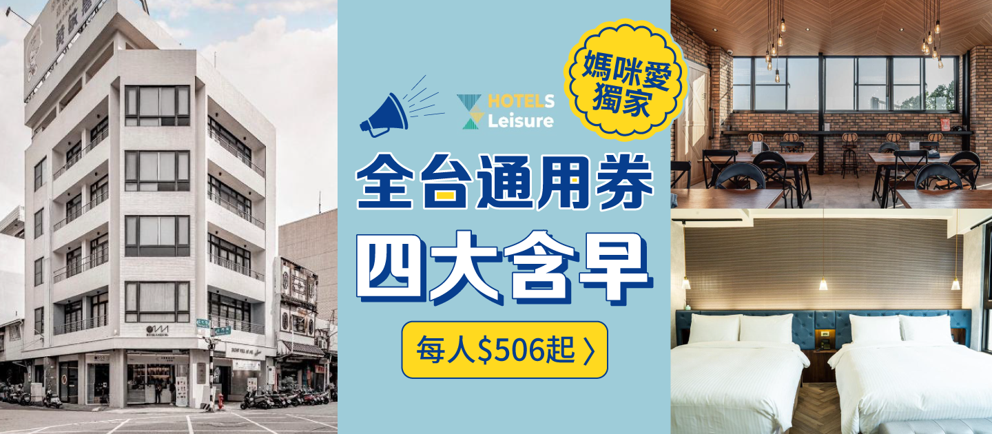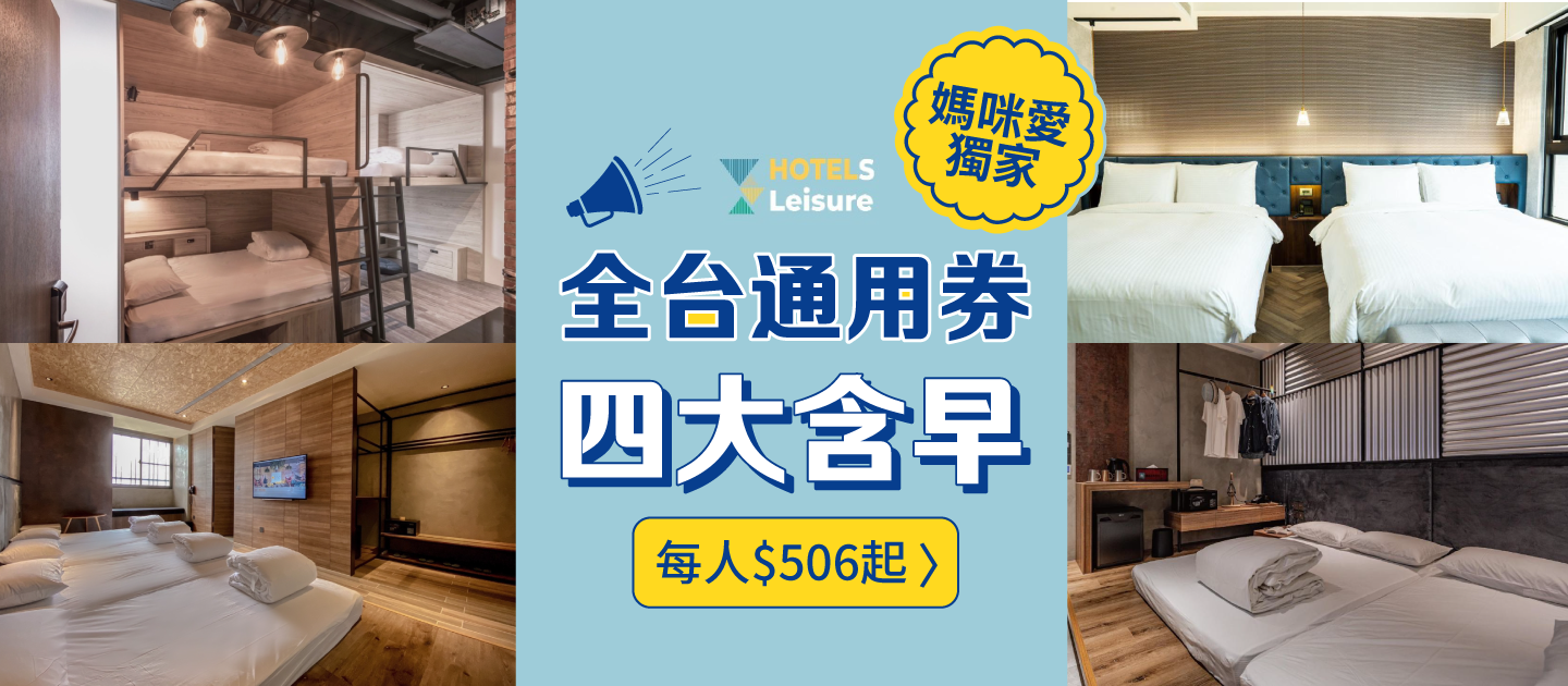 這次編媽要帶來超強北中南通用住宿券,是致力於創新與設計的【Hotel Leisure 飯店集團】的四人房住宿券!可選擇入住位於北中南各大熱門景點的分館,每人只需506元,即可入住體驗!可說是CP值爆棚的住宿券,不囤不行啊!從北到南玩不完,淡水、台中、嘉義、台南、高雄,五大分館通通位於市中心交通便利、觀光景點密集的一級戰區!
