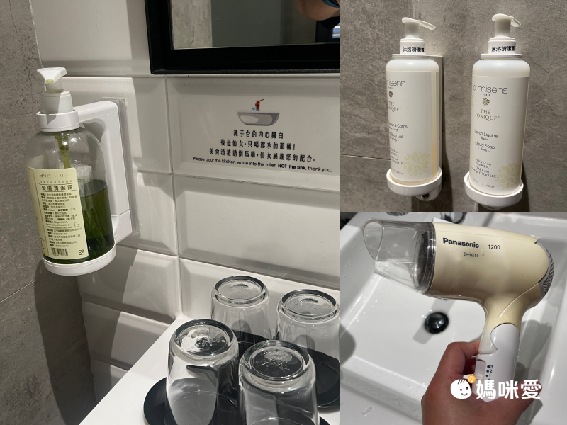 洗手台旁有香氣怡人的洗手乳,浴室內也有洗髮精沐浴乳,都是補充式的,非常環保這點我們很喜歡!