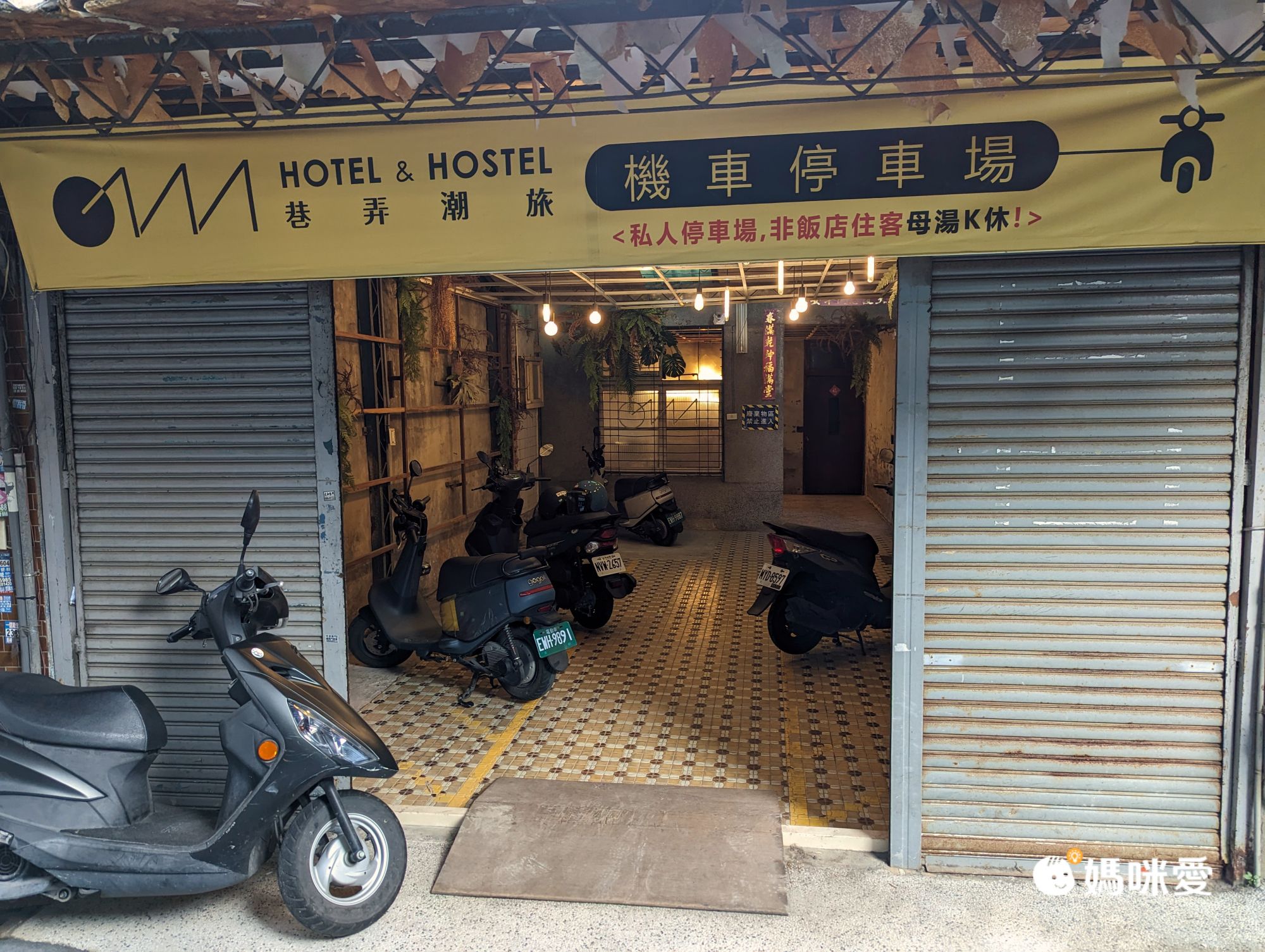 如是騎機車前來,【台南行旅(台南OINN HOTEL)】後門附近有規劃室內的機車停車空間,老地磚和點綴的植物,讓小空間顯得很舒適宜人。租借Gogoro也是在這邊取車,服務我們的工作人員(管家),會穿著統一的單寧工作圍裙,都非常年輕且親切地為我們介紹各項設施和服務!