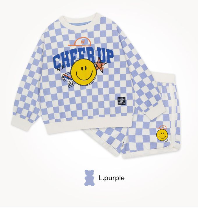 韓國 Jelispoon - 棋盤格笑臉印長袖上衣短褲套裝-藍紫
