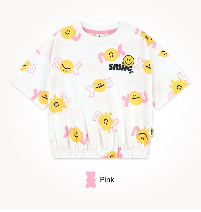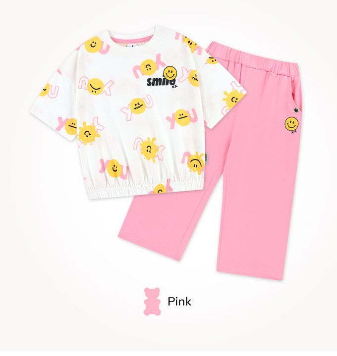 韓國 Jelispoon - 表情圖案印短袖上衣長褲套裝-粉紅