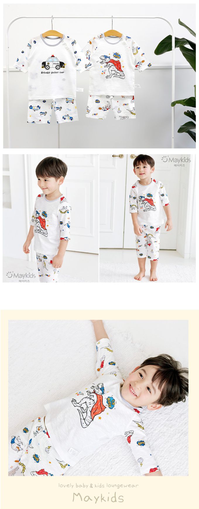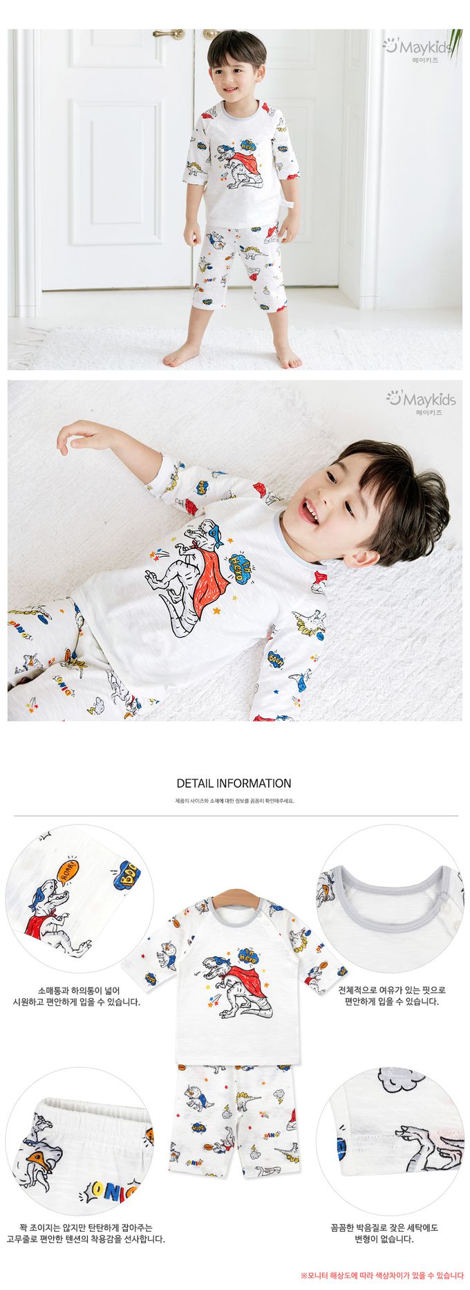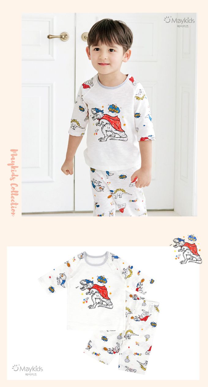 韓國 Maykids - 無螢光棉細柔七分袖家居服-漫畫恐龍英雄