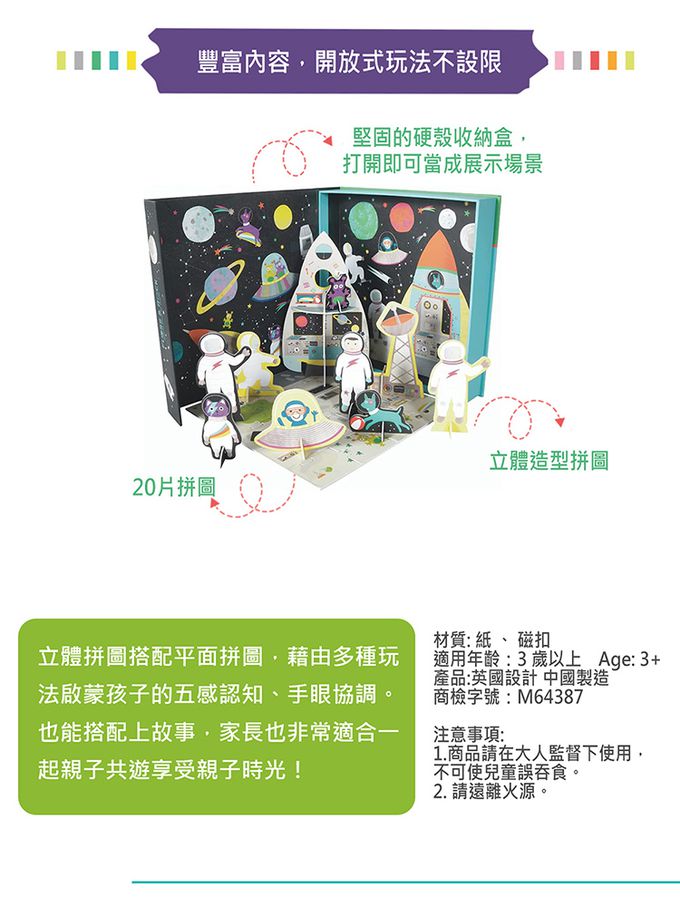 立體拼圖搭配平面拼圖,藉由多種玩法啟蒙孩子的五感認知、手眼協調。也能搭配上故事,家長也非常適合一起親子共遊享受親子時光!