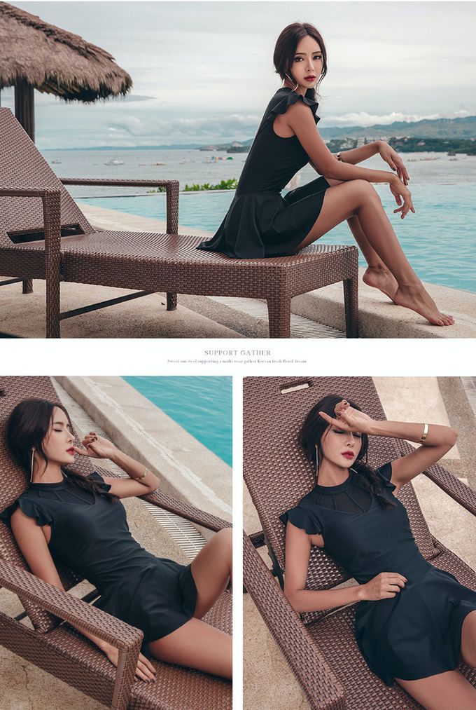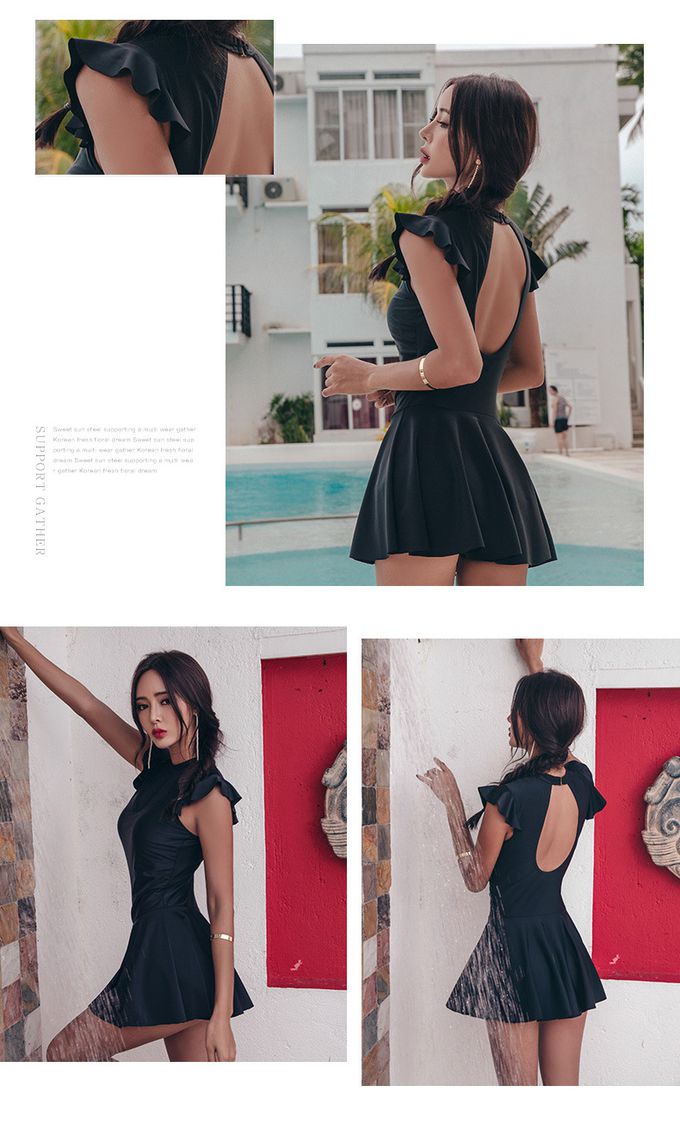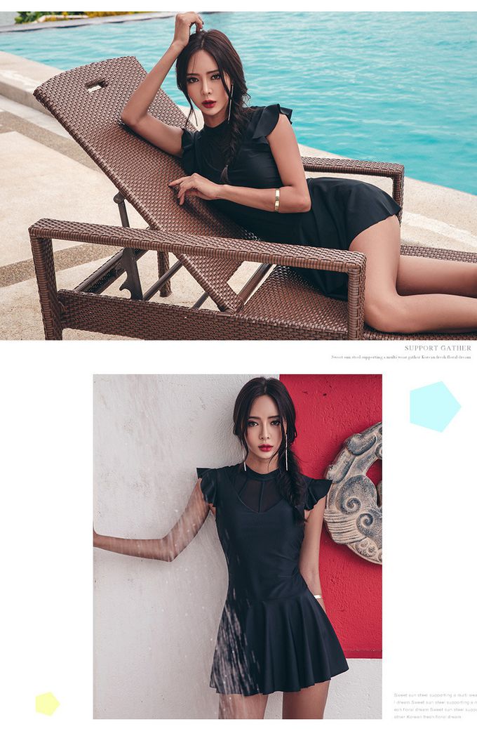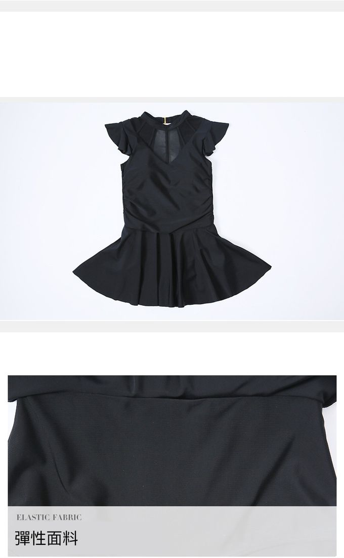 小心機網紗露背荷葉袖連身泳衣-黑色