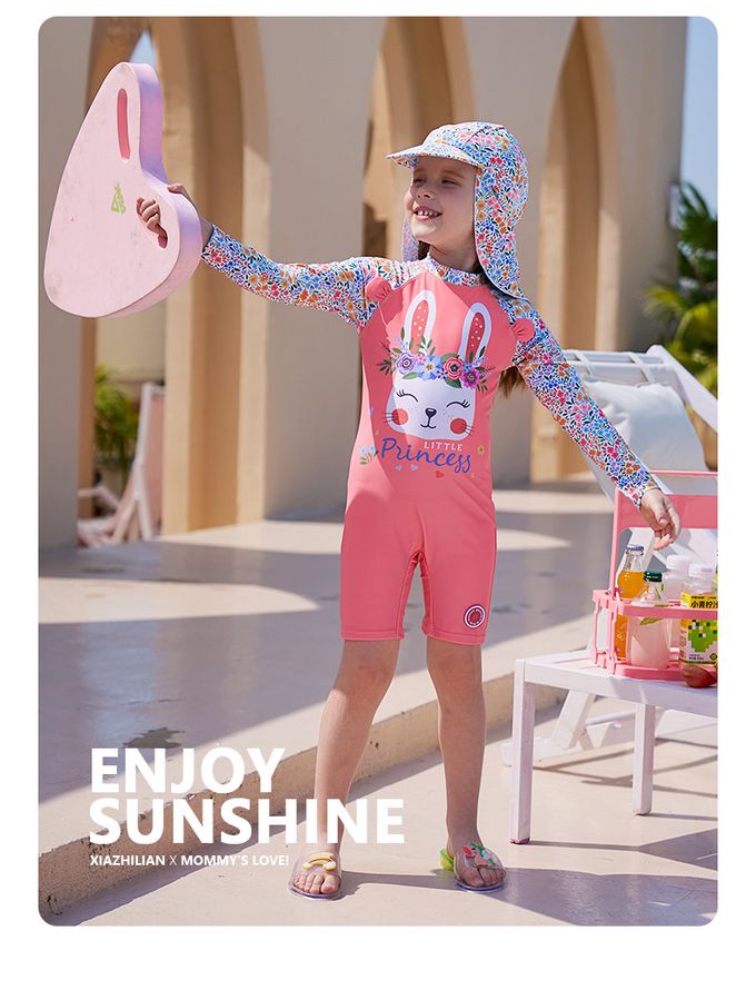 Xiazhilian - 女寶防曬長袖連身泳裝套裝(附帽子)-花圈兔兔-粉色