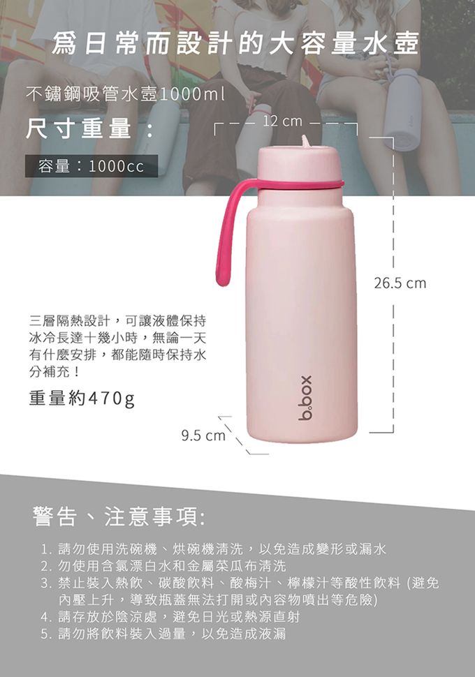 注意事項:注意事項 : 1. 請勿使用洗碗機、烘碗機清洗,以免造成變形或漏水。 2. 勿使用含氯漂白水和金屬菜瓜布清洗 3. 禁止裝入熱飲、碳酸飲料、酸梅汁、檸檬汁等酸性飲料。 (避免內壓上升,導致瓶蓋無法打開或內容物噴出等危險) 4. 請存放於陰涼處,避免日光或熱源直射 5. 請勿將飲料裝入過量,以免造成液漏