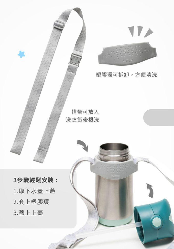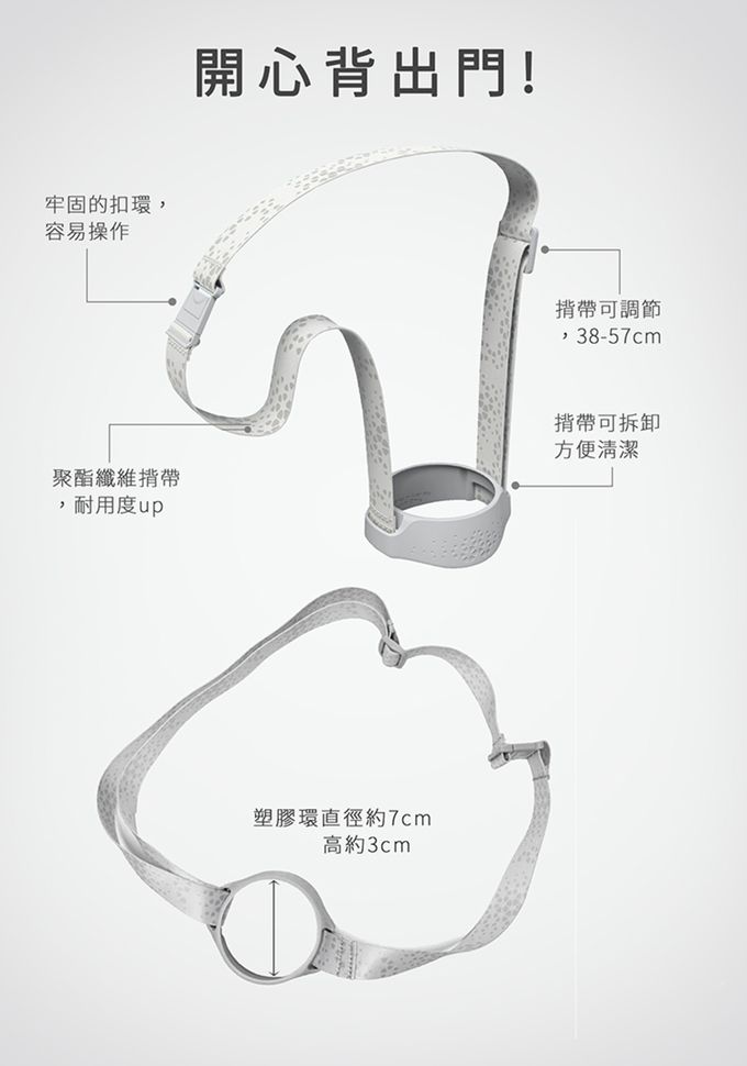水瓶揹帶的塑膠環可拆卸,方便清洗,揹帶可放入洗衣袋後機洗。