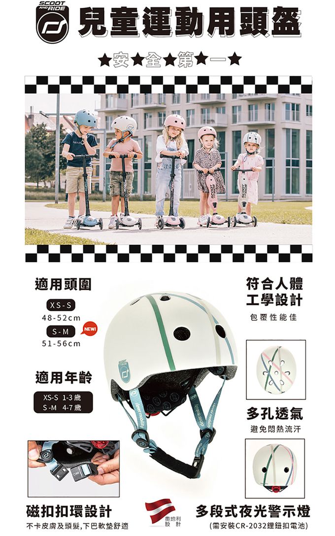 ●頭盔後LED警示燈設計,加倍保護寶寶安全,專為幼兒設計簡易開關的磁力鎖扣,防止幼兒夾頭髮及皮膚