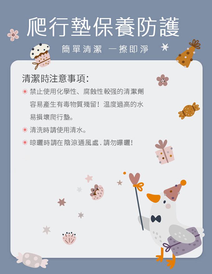 注意事項:1. 本產品應在成人監護下使用 2. 包裝袋不是玩具,請勿讓兒童接觸。 3. 請遠離火源 4. 因台灣天氣潮濕,平時可開除濕機保養,地墊如無使用時請立起放置於通風處,保持地墊乾燥。 5. 請勿長時間把傢俱或重物放置於地墊上,以免造成地墊變形。