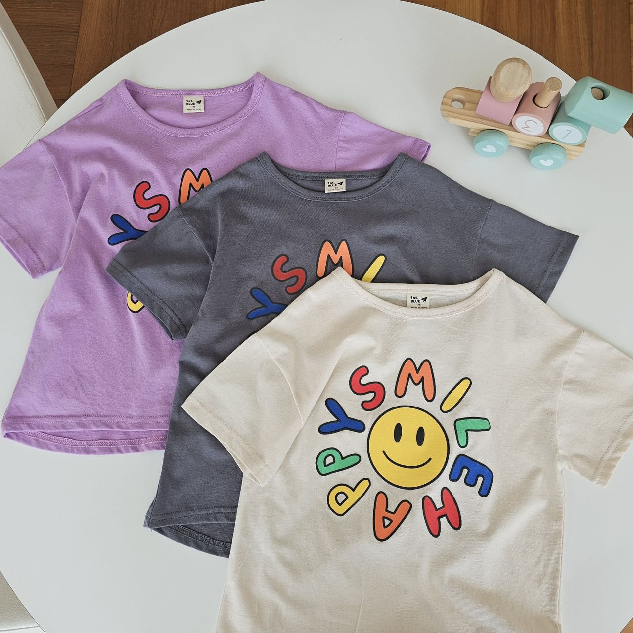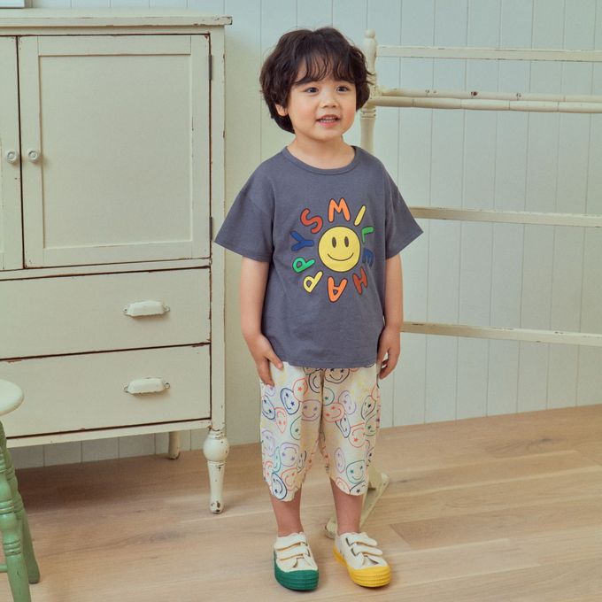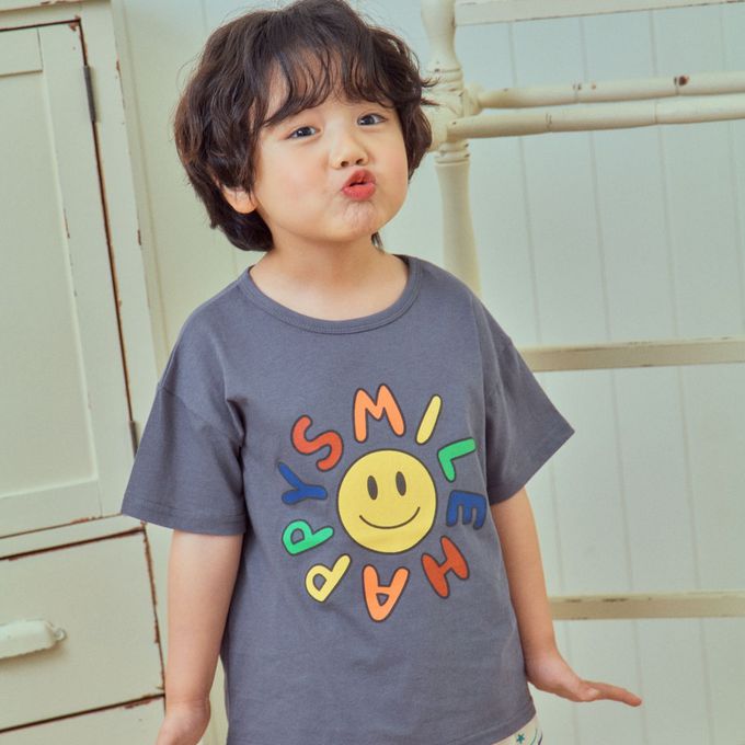 韓國 First Blue - 彩色笑臉印短袖上衣-墨灰