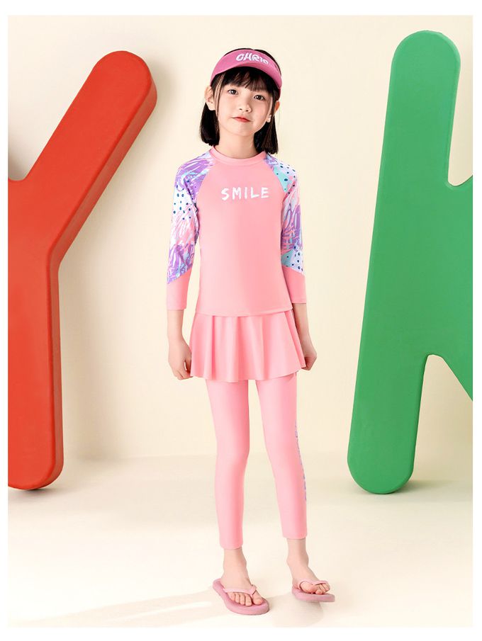 女寶長袖防曬泳裝套裝-夏日印花-粉色
