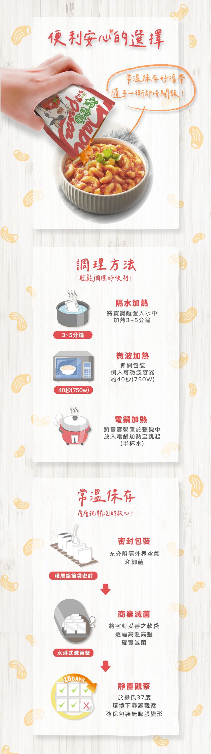 成分:水、彎管麵(杜蘭沙粒粉、水)、牛肉、番茄、番茄糊(番茄)、洋蔥、紅蘿蔔、芹菜、蒜頭、初榨酪梨油、鹽、羅勒葉