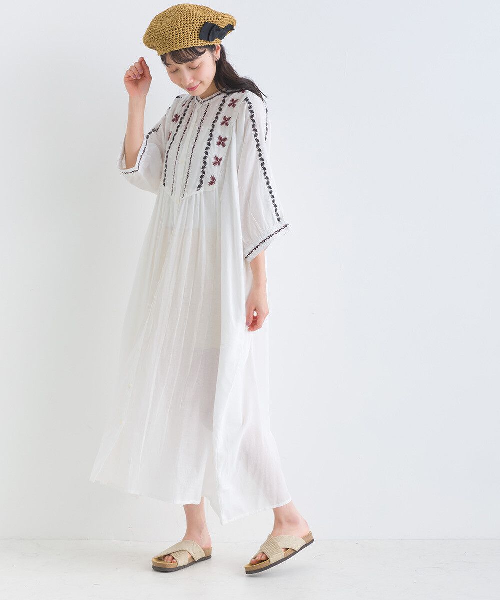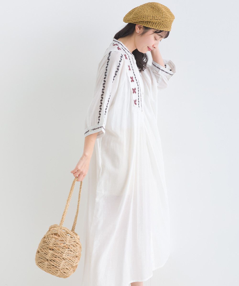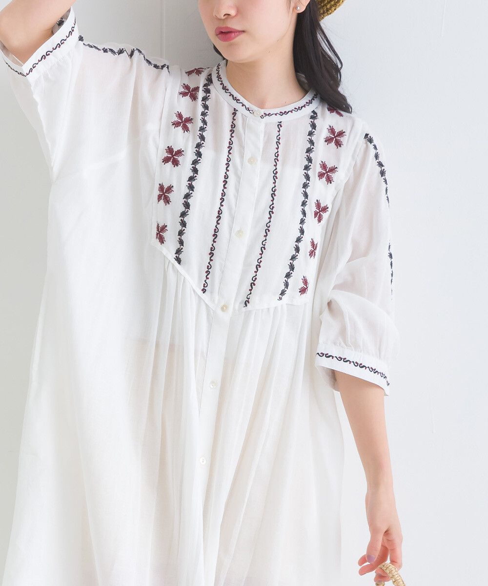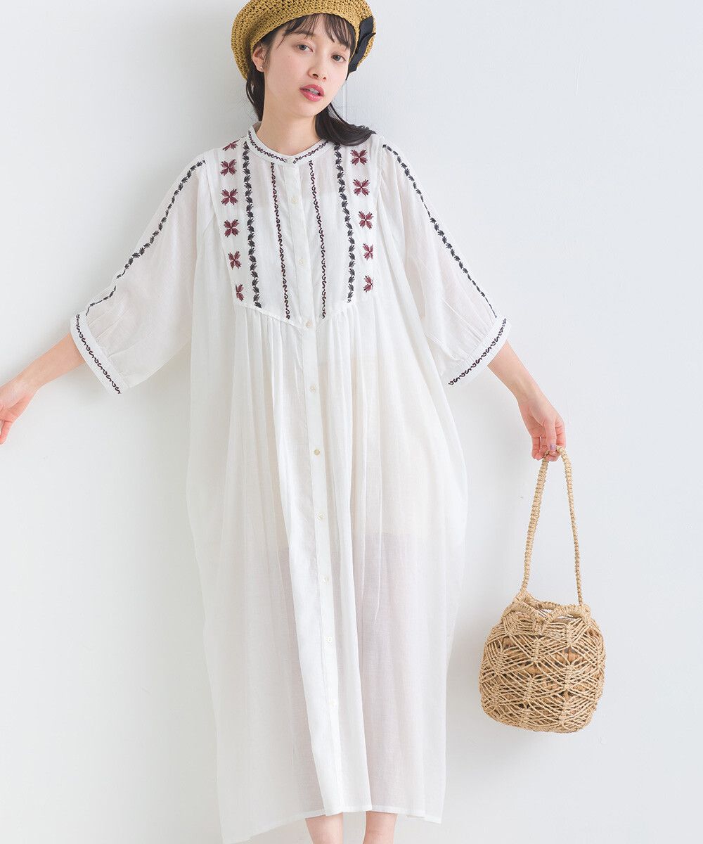 日本 Lupilien - 100%印度棉 清爽刺繡襯衫式長洋裝-白色
