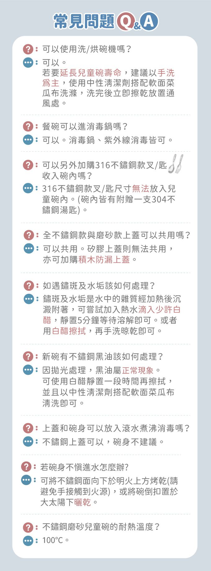 注意事項:1.不適用於各式爐具以及微波爐、電鍋進行加熱。 2.避免使用烘碗機及洗碗機,以手洗清潔為主,可有效延長商品壽命。 2.清洗請使用中性洗碗劑,並以軟布或海綿刷洗,勿用鋼刷或菜瓜布以免刮傷。 3.請避免重摔或敲擊本產品,以免產品變形。