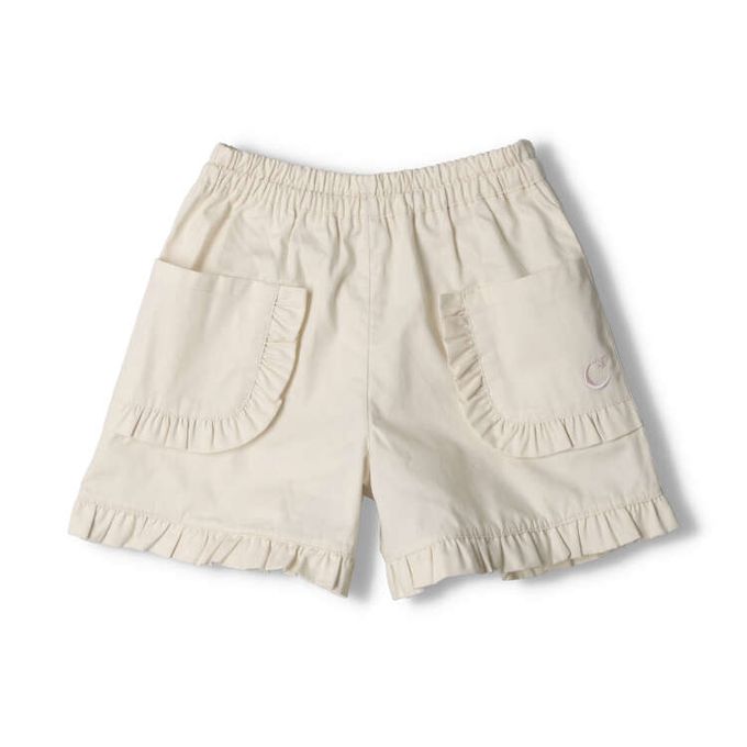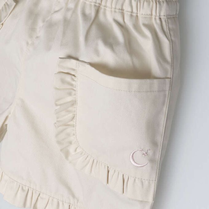 素面3分褲。左側口袋點綴月亮和星星的刺繡