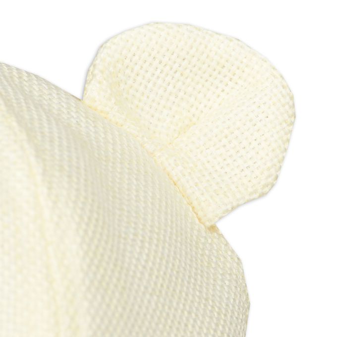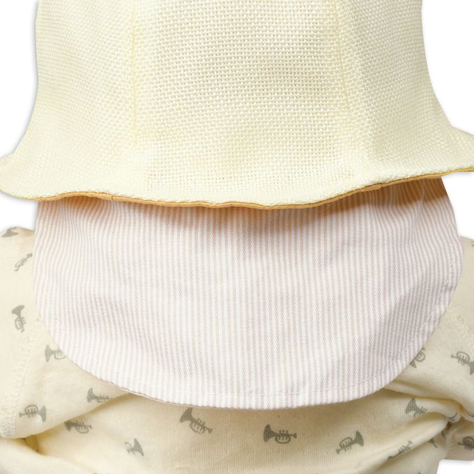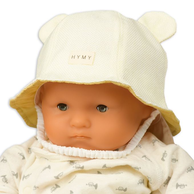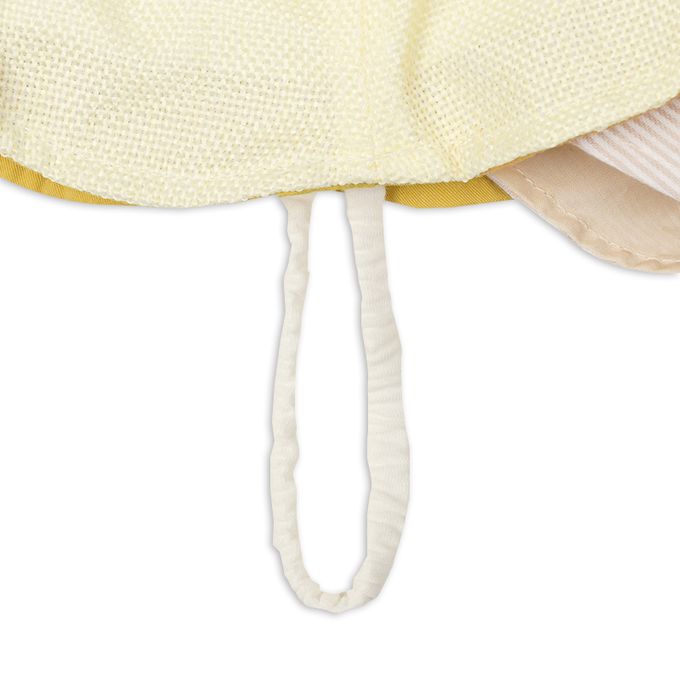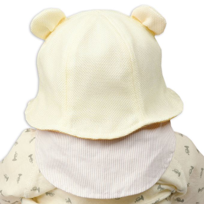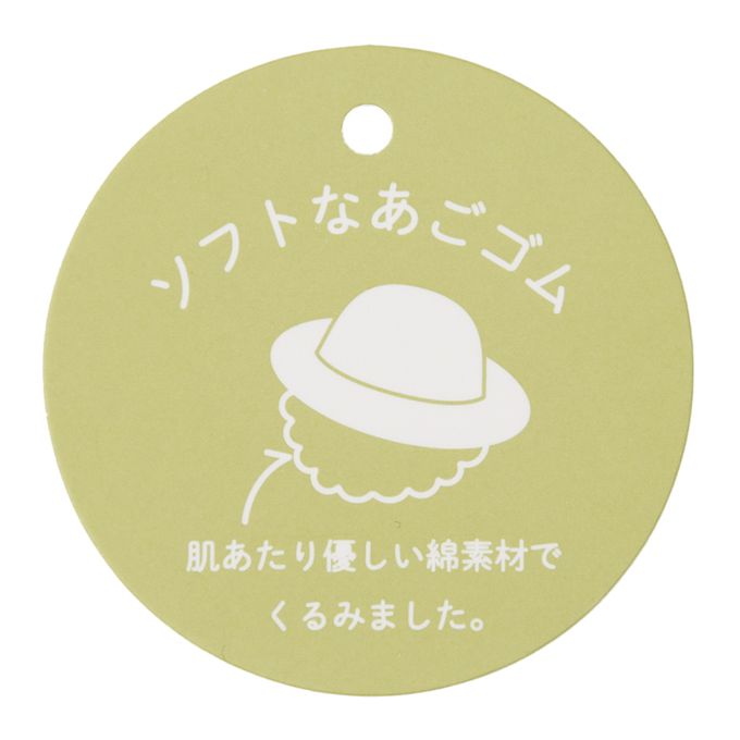 下巴有鬆緊帶可防止被風等吹落。 下巴鬆緊帶用布料裹住,使膚觸更舒適。