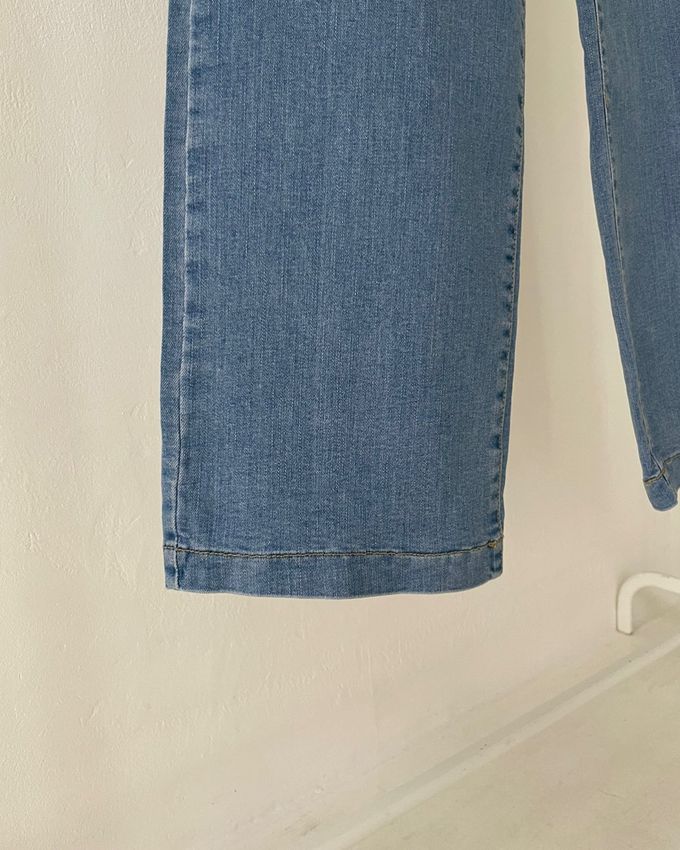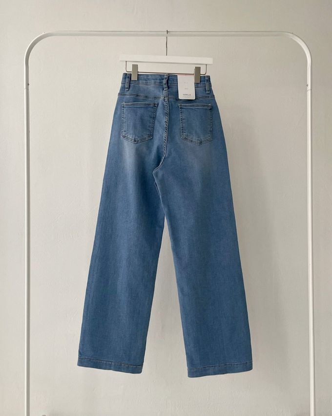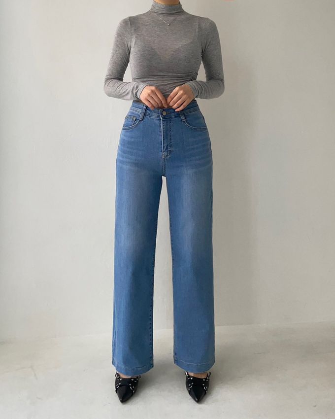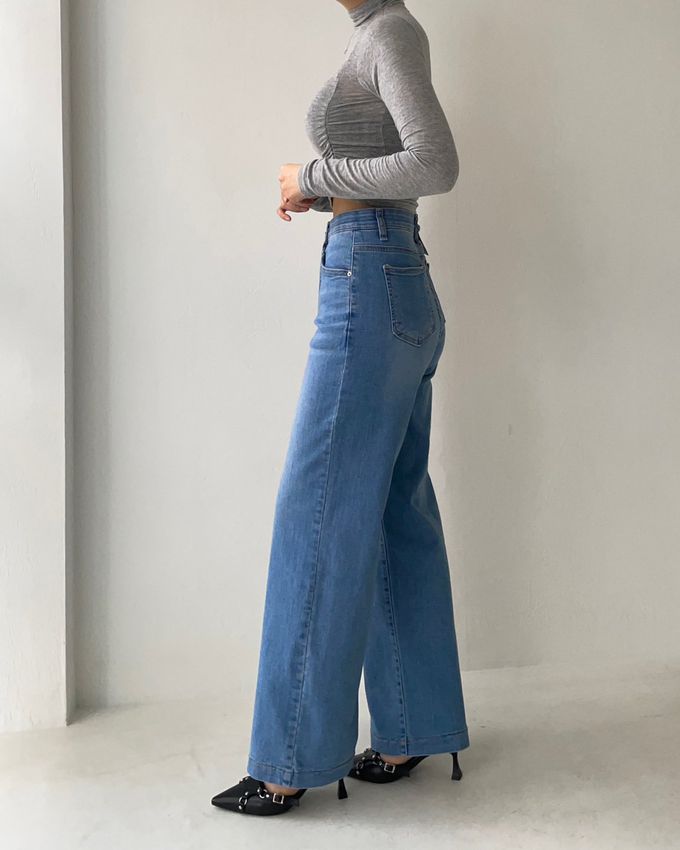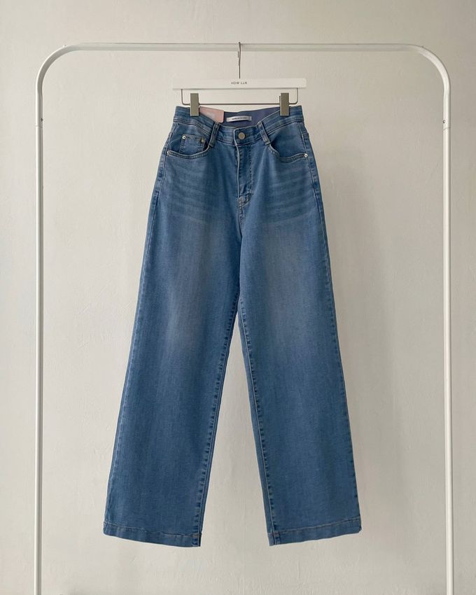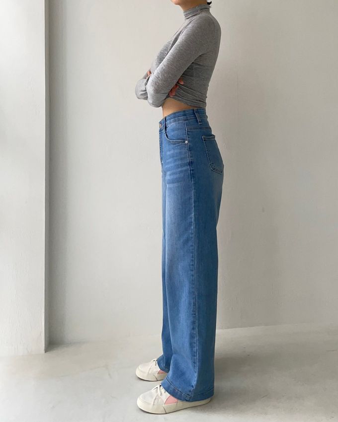 韓國女裝連線 - 彈性腰一字牛仔落地褲-淺藍