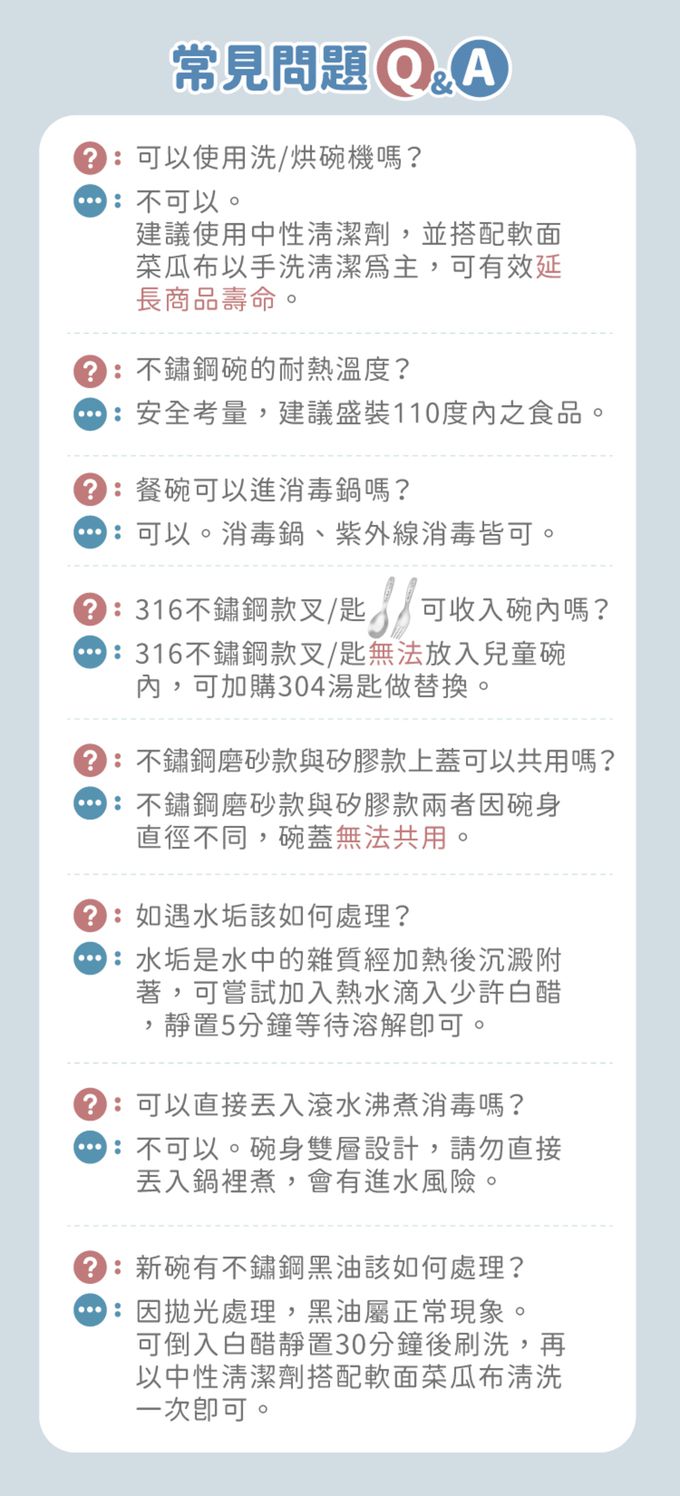 注意事項:1.不適用於各式爐具以及微波爐、電鍋進行加熱。 2.避免使用烘碗機及洗碗機,以手洗清潔為主,可有效延長商品壽命。 2.清洗請使用中性洗碗劑,並以軟布或海綿刷洗,勿用鋼刷或菜瓜布以免刮傷。 3.請避免重摔或敲擊本產品,以免產品變形。
