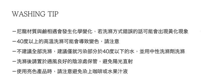 *尼龍雖然是耐濕的材質,但材質本身並沒有防水功能,若不慎沾到咖啡或其他污染物,建議儘快用30度的溫水清洗髒污部分。