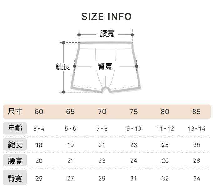 60號[3-4Y]、65號[5-6Y]、70號[7-8Y]、75號[9-10Y]、80號[11-12Y]、85號[13-14Y]