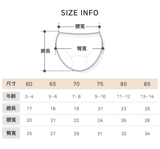 60號[3-4Y]、65號[5-6Y]、70號[7-8Y]、75號[9-10Y]、80號[11-12Y]、85號[13-14Y]