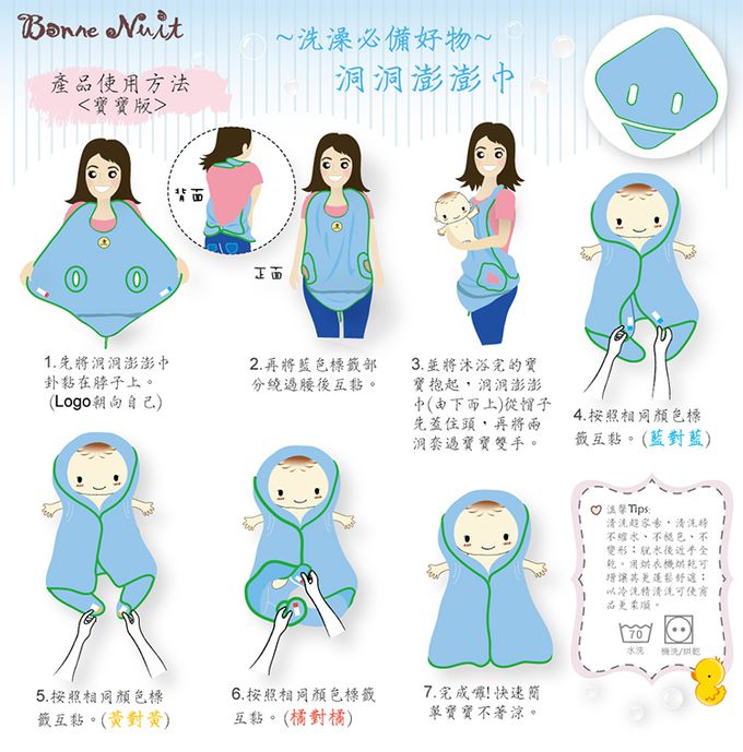 寶寶沐浴後可開始包覆,以雪柔棉速乾材質擦乾後,圍裙脖圍解下來可環抱在寶寶包巾上,