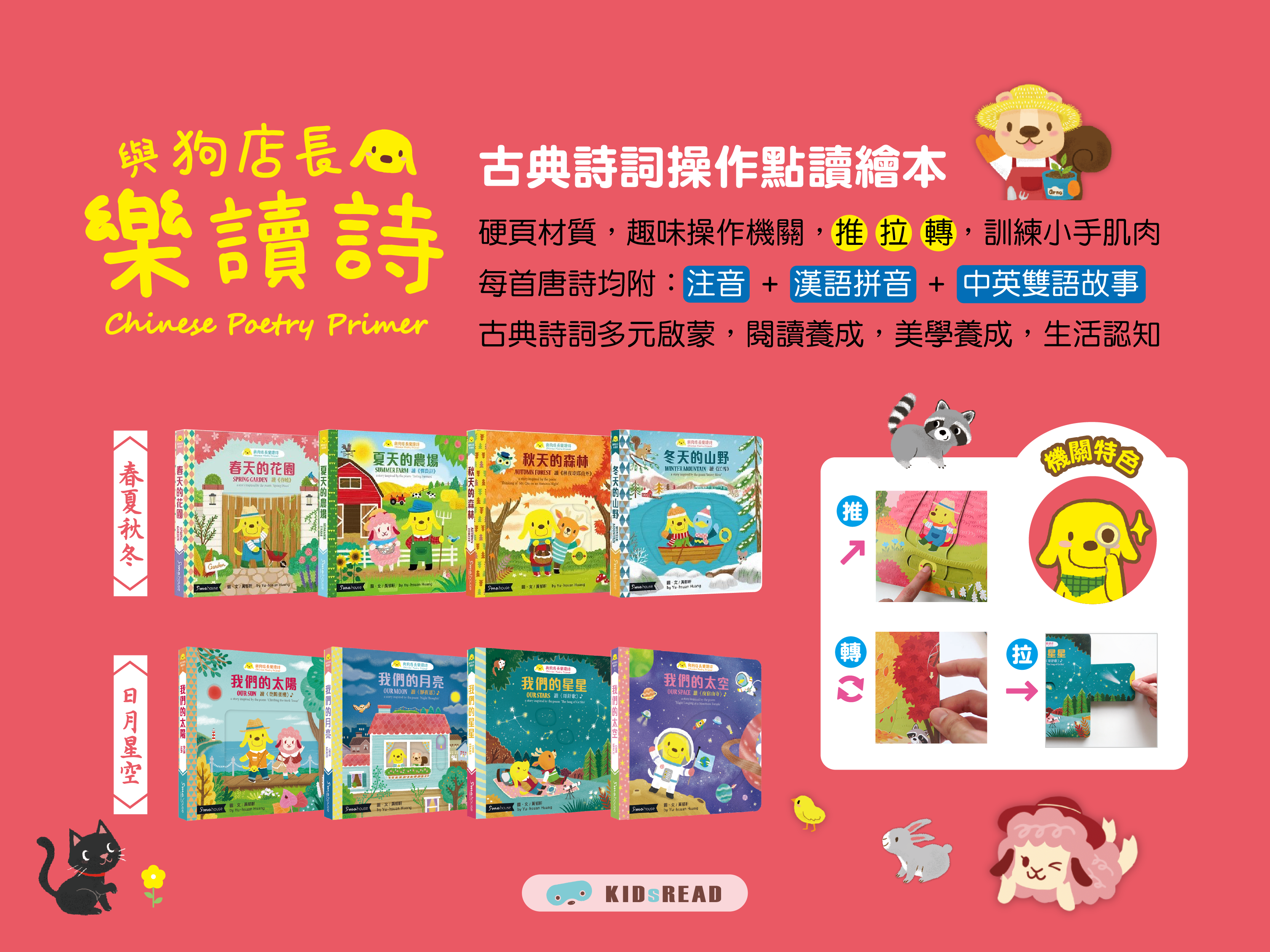 KIDsREAD在《與狗店長樂讀詩》系列繪本中運用創新手法,帶領幼兒進入中華古典文學世界!在幼兒學習的黃金時期,透過共讀故事、朗誦詩句,灌溉文字美感的養分。讓孩子聽到前奏就會開始朗朗上口,無痛背詩!對孩子來說絕對是本優質的唐詩啟蒙繪本!