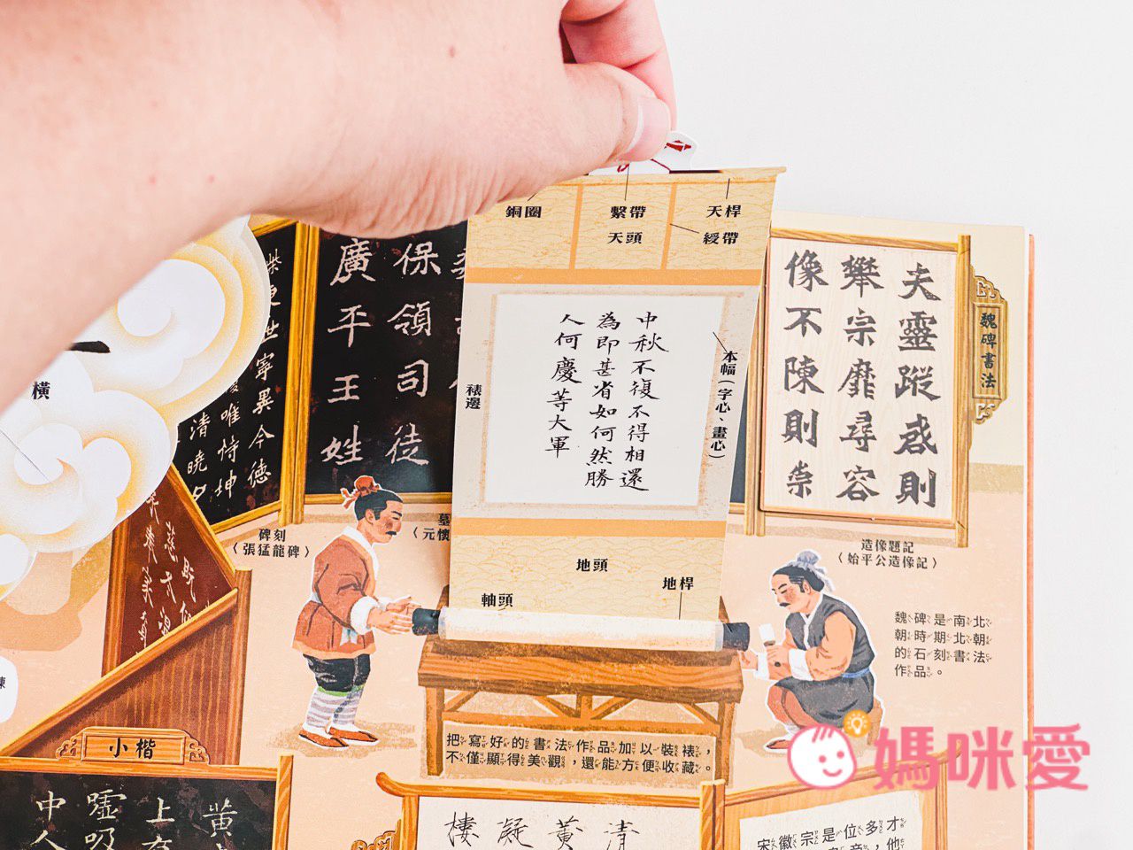 第一頁的機關就令大人小孩驚呼!畫風非常優美~有種正坐在宣紙前準備拿起毛筆寫書法的感覺。書法是一種表現漢字的書寫藝術!漢字的字體經歷多次的演變,最終形成五種字體,分別是:篆書、隸書、楷書、行書和草書。