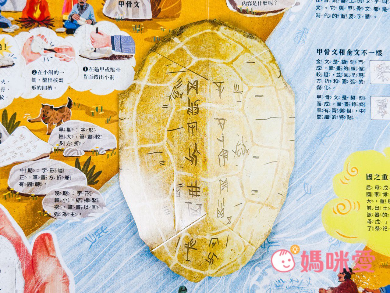 媽咪一看到大龜殼上有刻字,就瞬間聯想到是古老神秘的『甲骨文』,它不僅是目前所知中國最早具有體系的文字,也是中國書法藝術的早期表現形式。