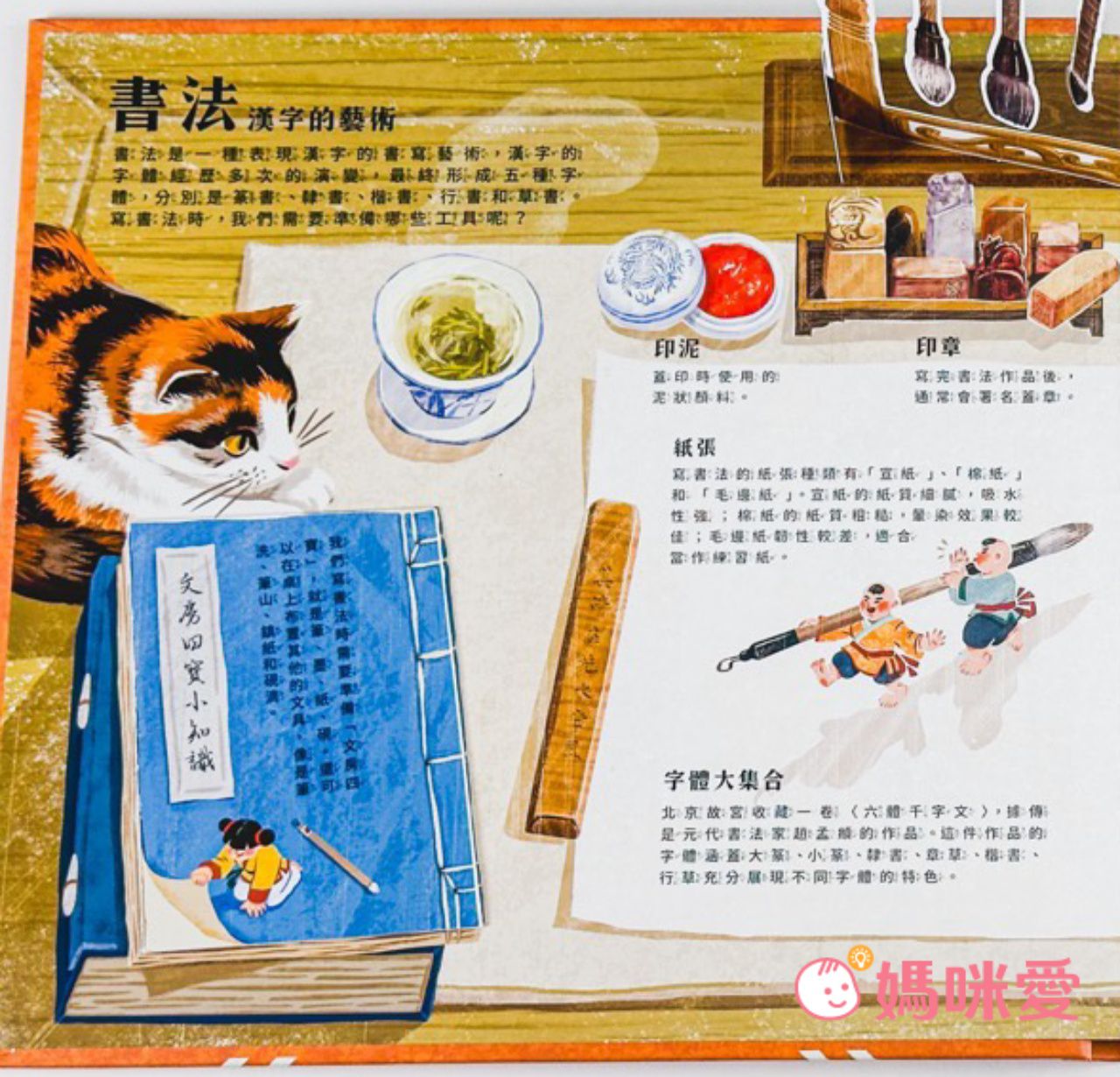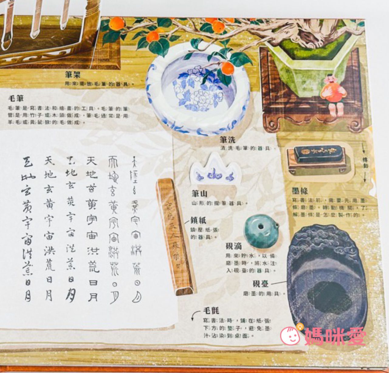 書中左下角還有一本小小的《文房四寶小知識》讓孩子能知道像是:毛筆的特性、墨條種類、硯臺、宣紙的製作過程等知識