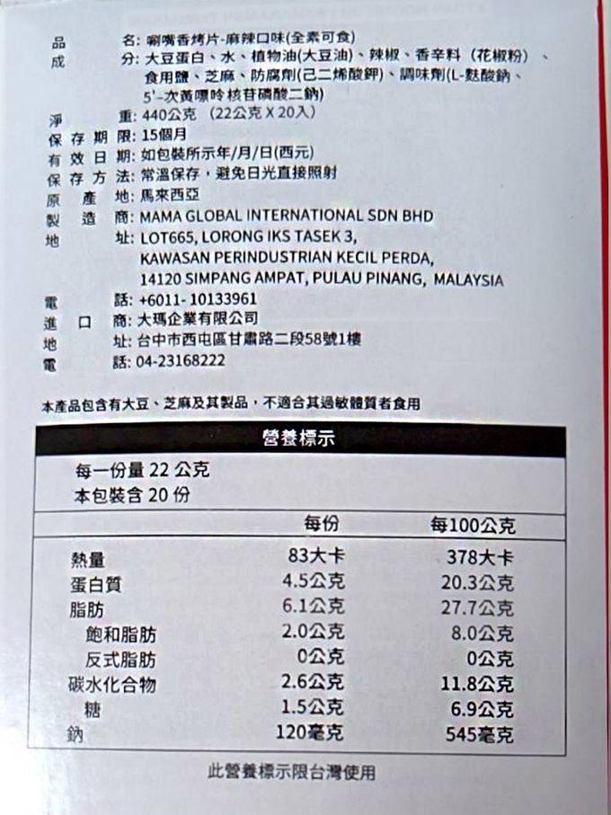成分:品名:【mamavege】唰嘴香烤片-燒烤口味(全素可食) 成分:大豆蛋白、水、植物油(棕櫚油)、食用鹽、辣椒、馬芹、芝麻、香辛料(馬芹粉)、調味劑(L-麩酸鈉、5'–次黃嘌呤核苷磷酸二鈉、5 '–鳥嘌呤核苷磷酸二鈉)、防腐劑(己二烯酸鉀) 品名:【mamavege】唰嘴香烤片-麻辣口味(全素可食) 成 分:大豆蛋白、水、植物油(棕櫚油)、食用鹽、辣椒、花椒、芝麻、香辛料(花椒粉)、調味劑(L-麩酸鈉、5'–次黃嘌呤核苷磷酸二鈉、5 '–鳥嘌呤核苷磷酸二鈉)、防腐劑(己二烯酸鉀)