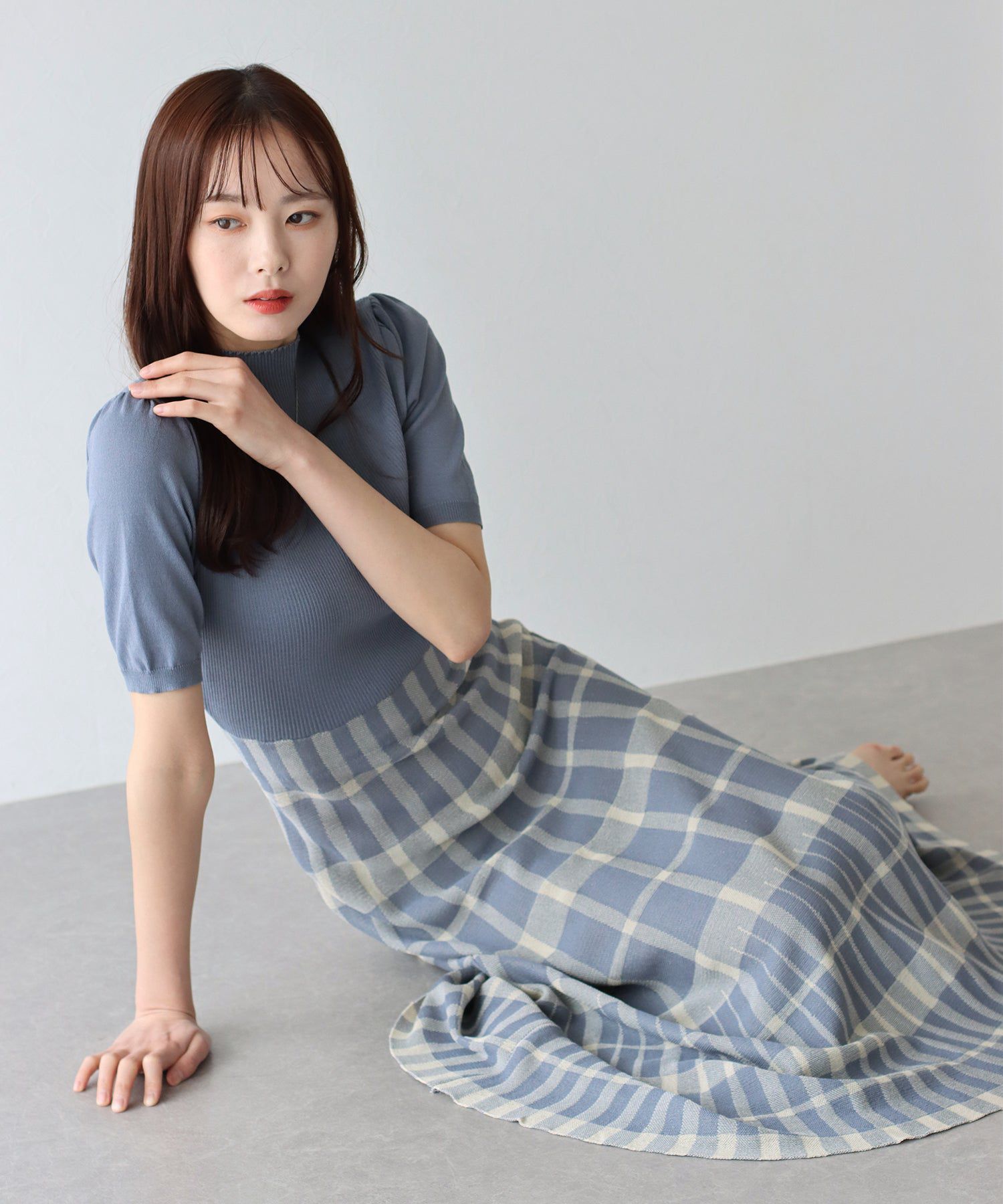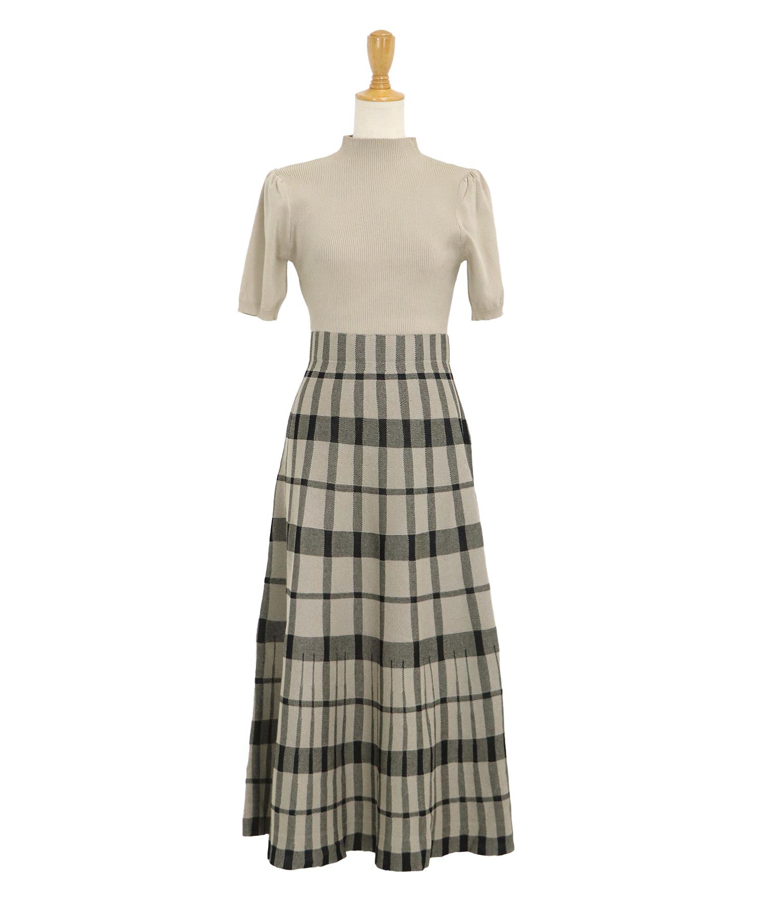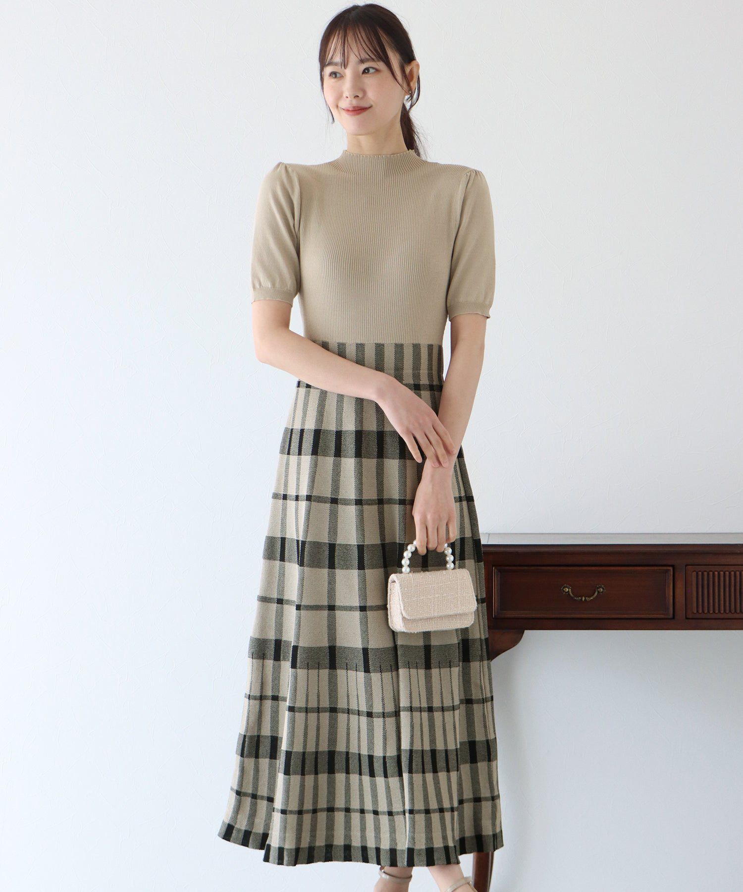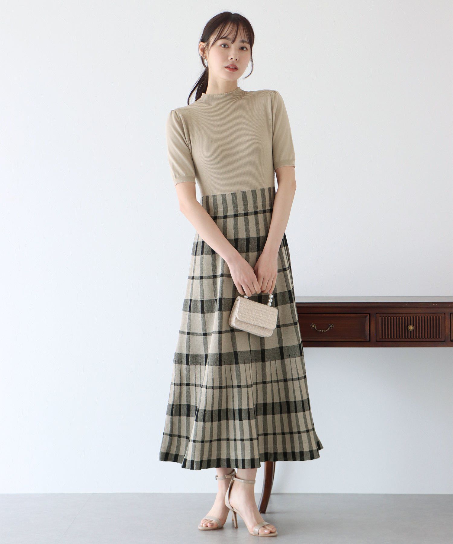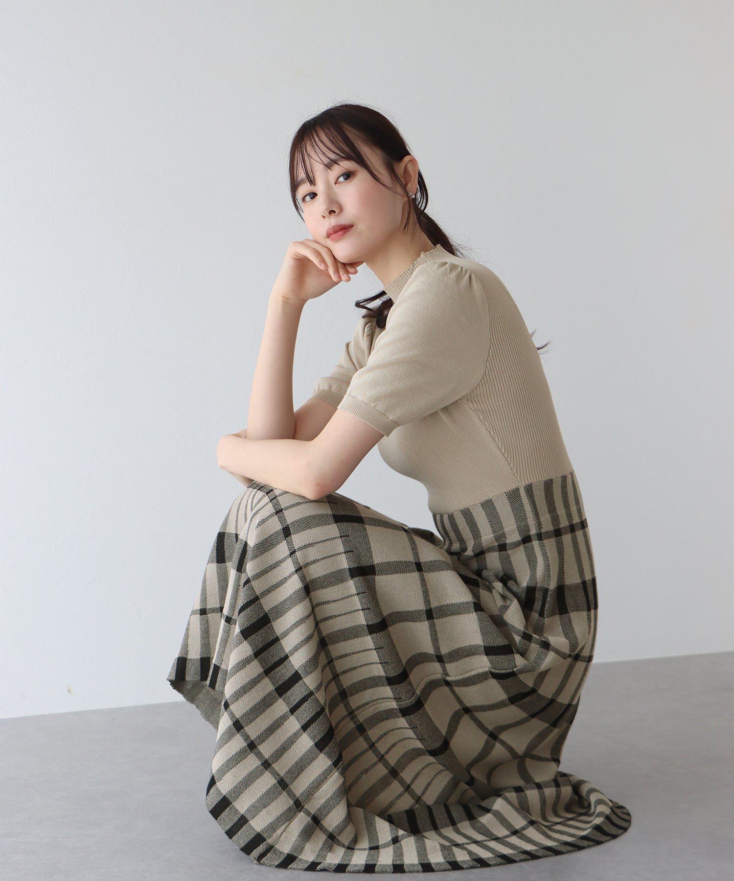 日本 BLUE EAST - 優雅高腰針織短袖洋裝-格紋-卡其