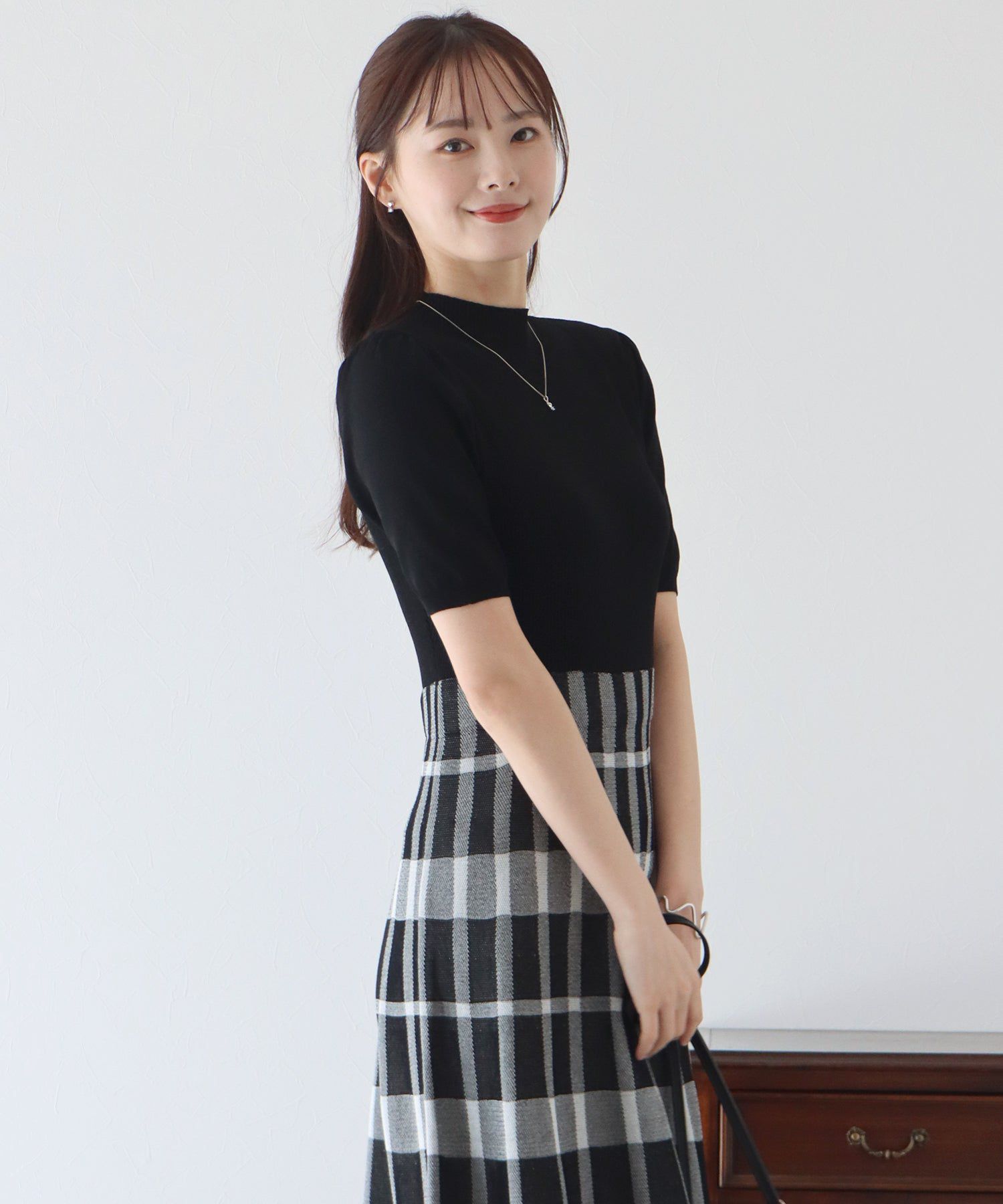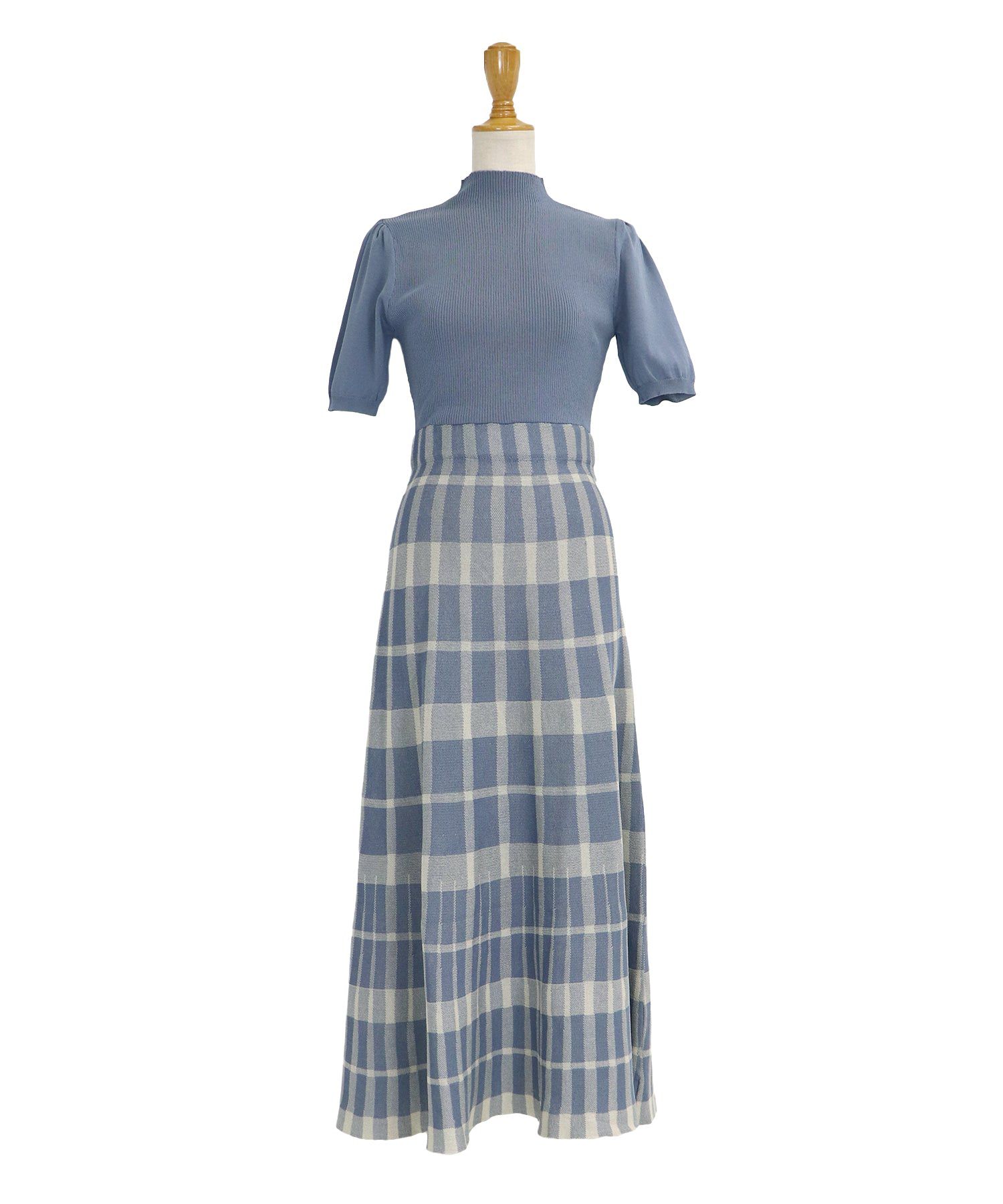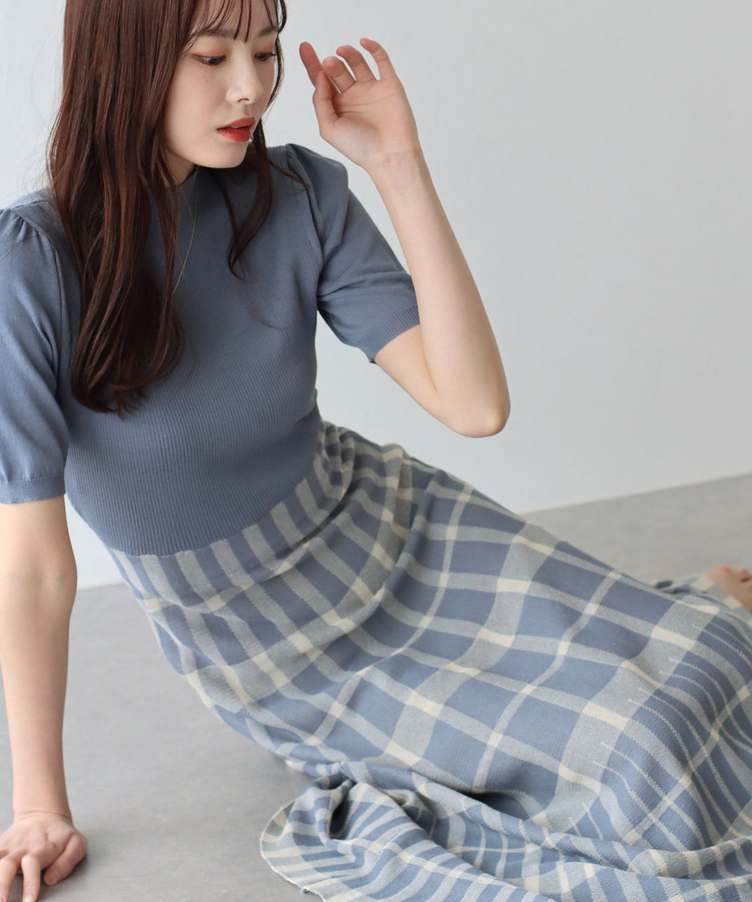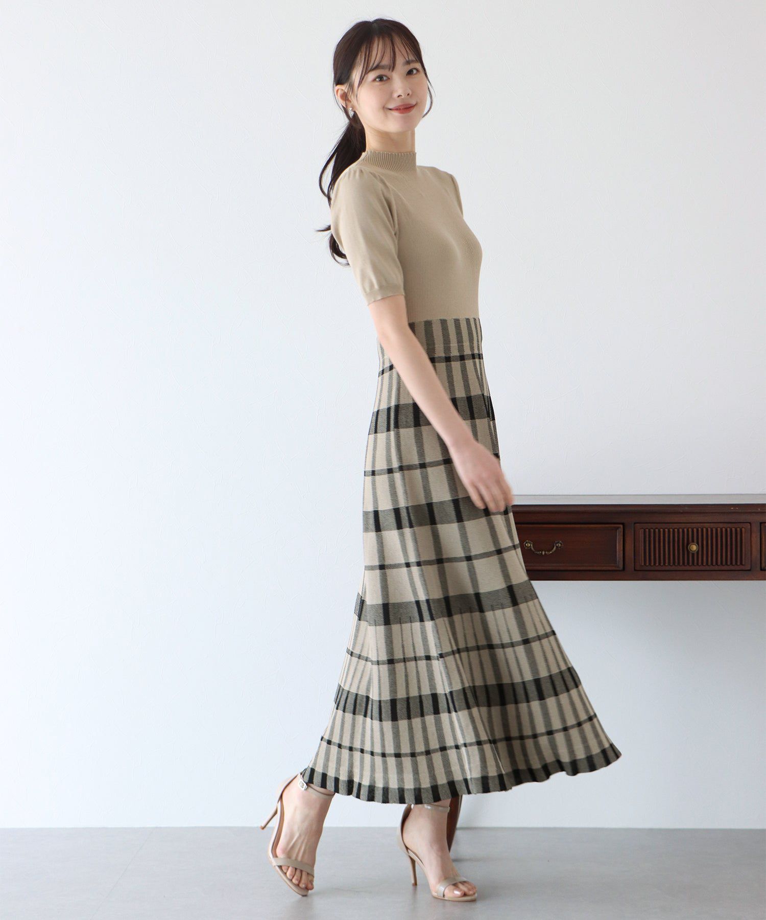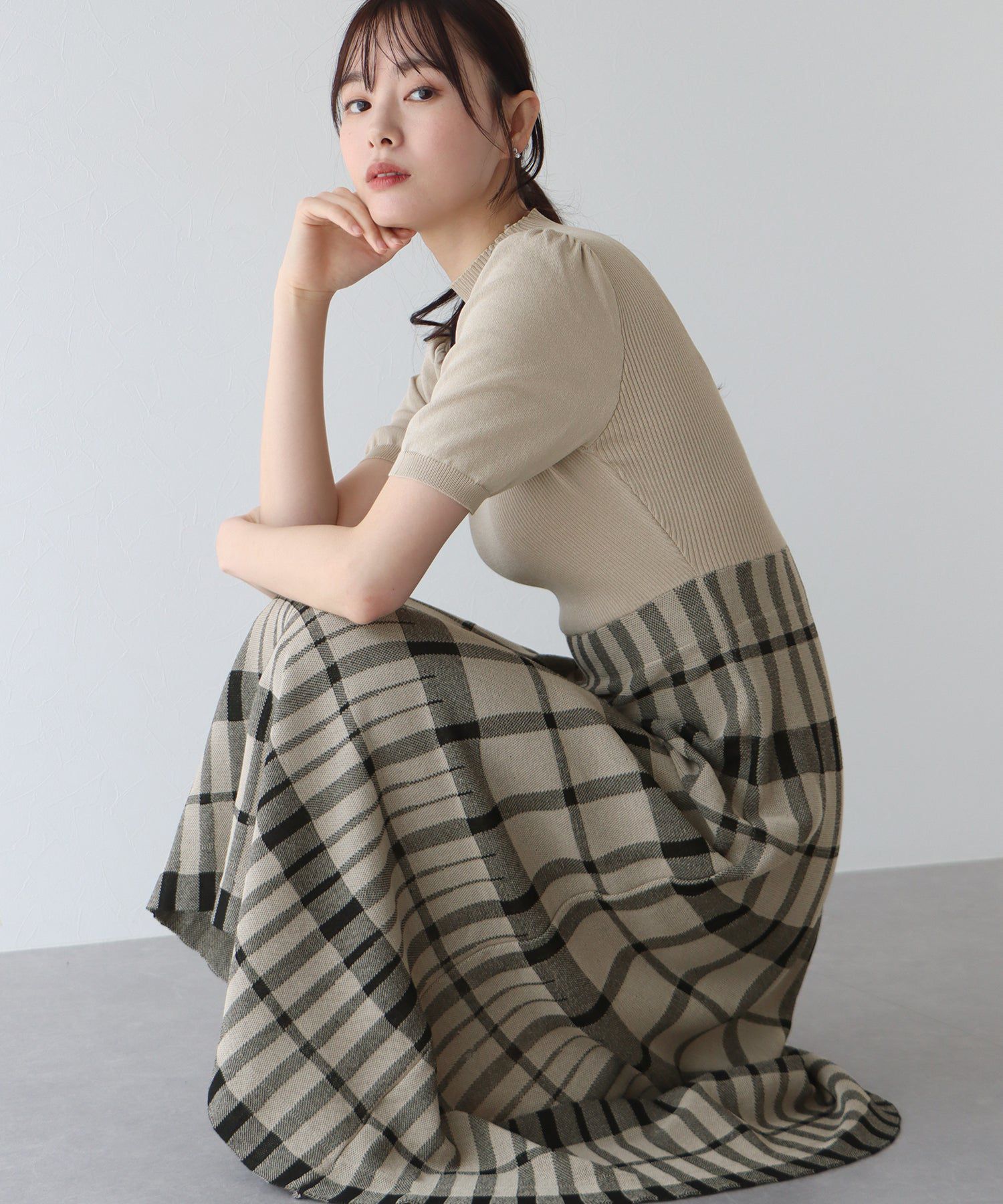 日本 BLUE EAST - 優雅高腰針織短袖洋裝-格紋-卡其