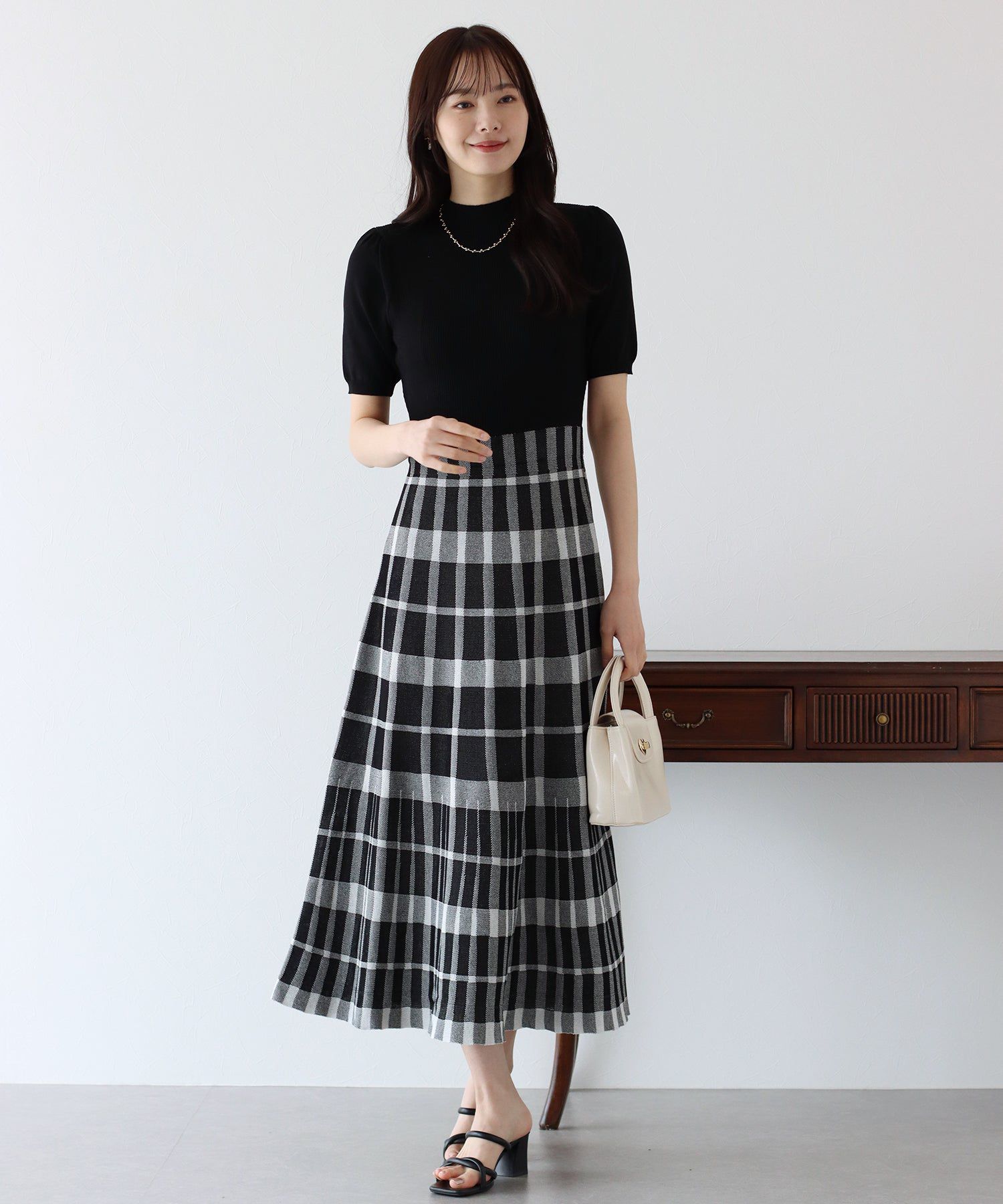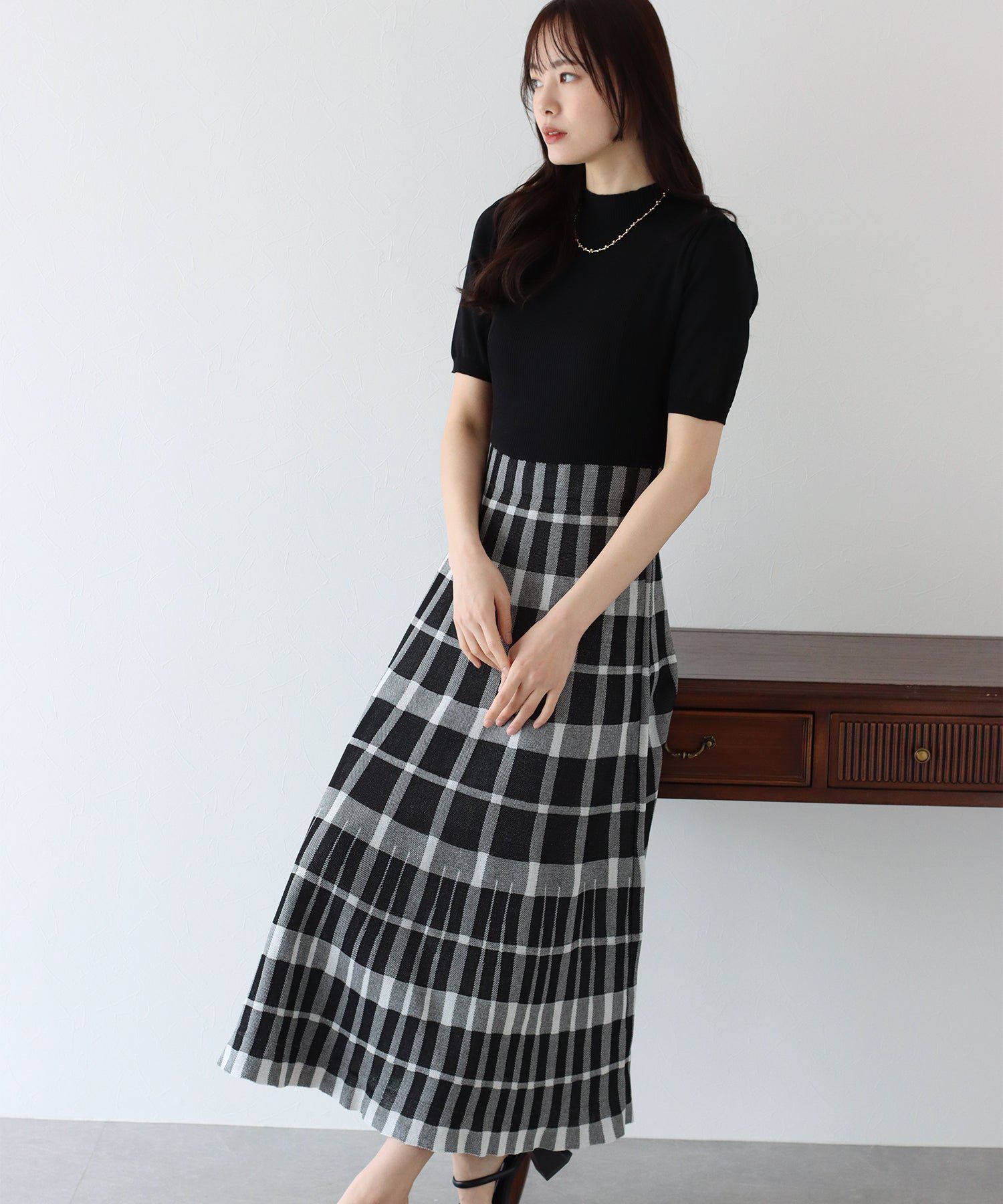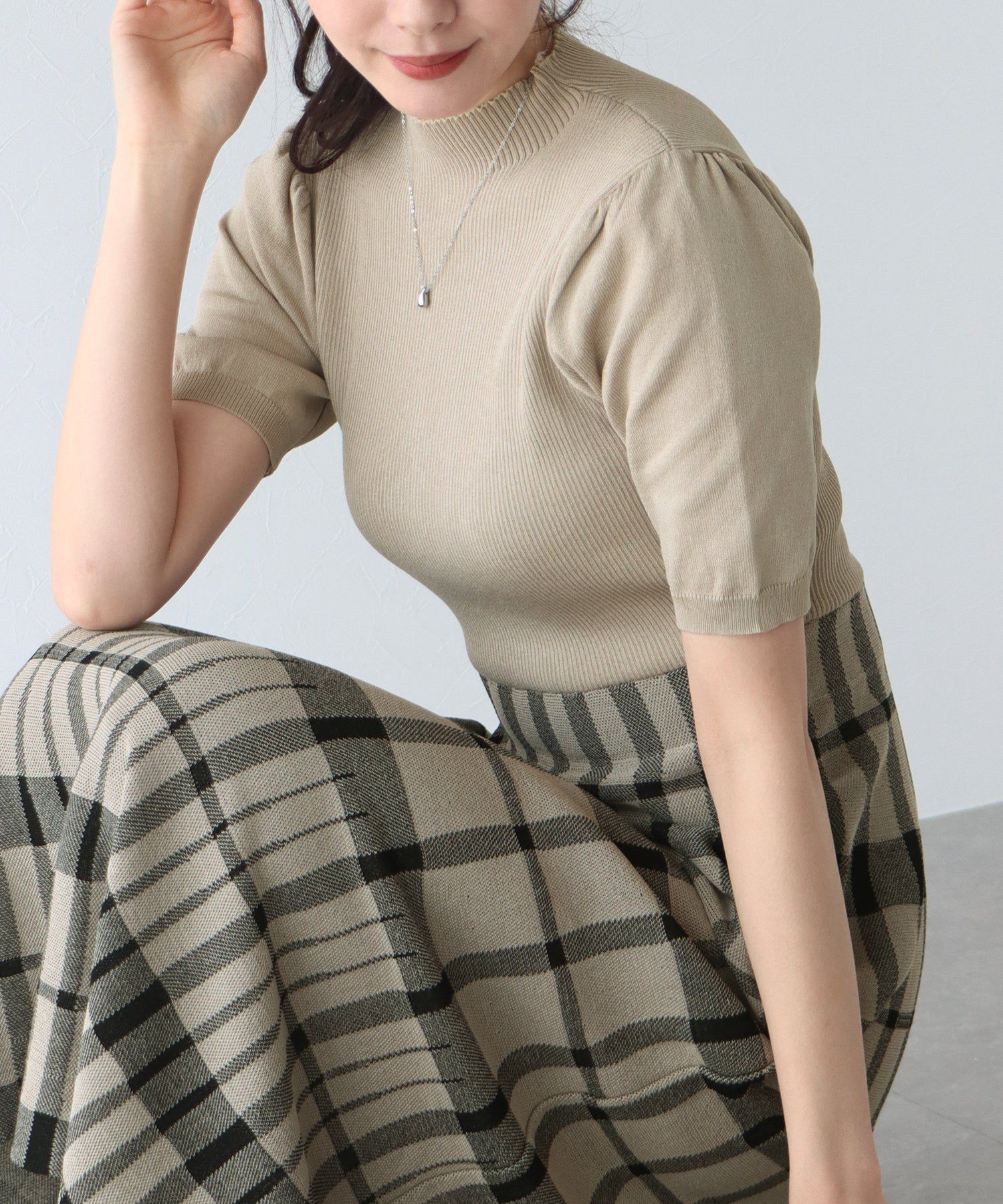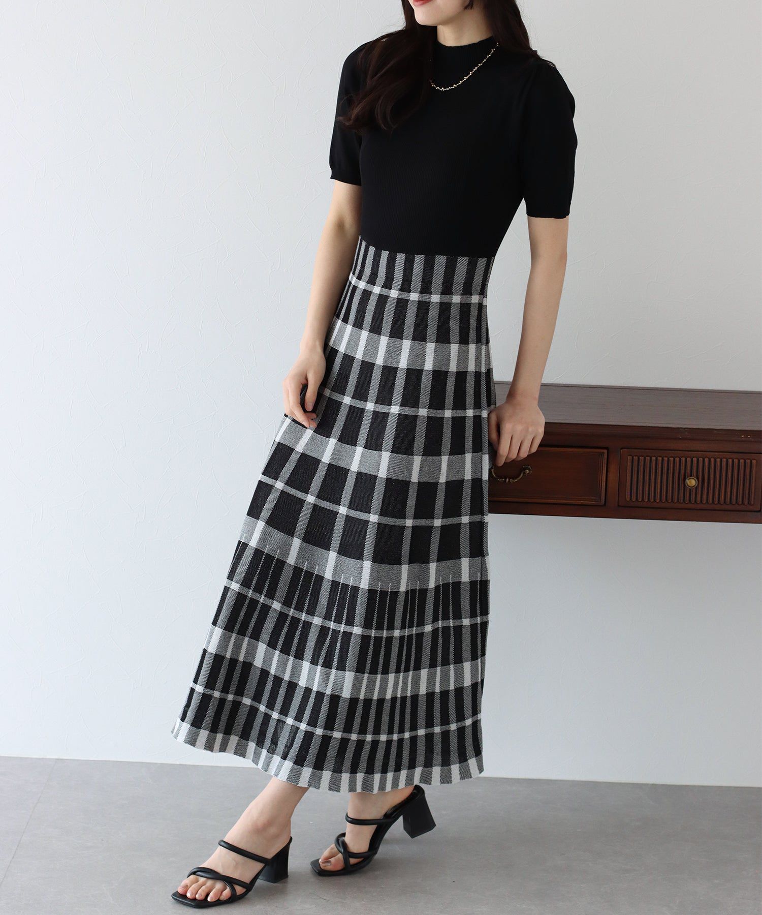 日本 BLUE EAST - 優雅高腰針織短袖洋裝-格紋-卡其