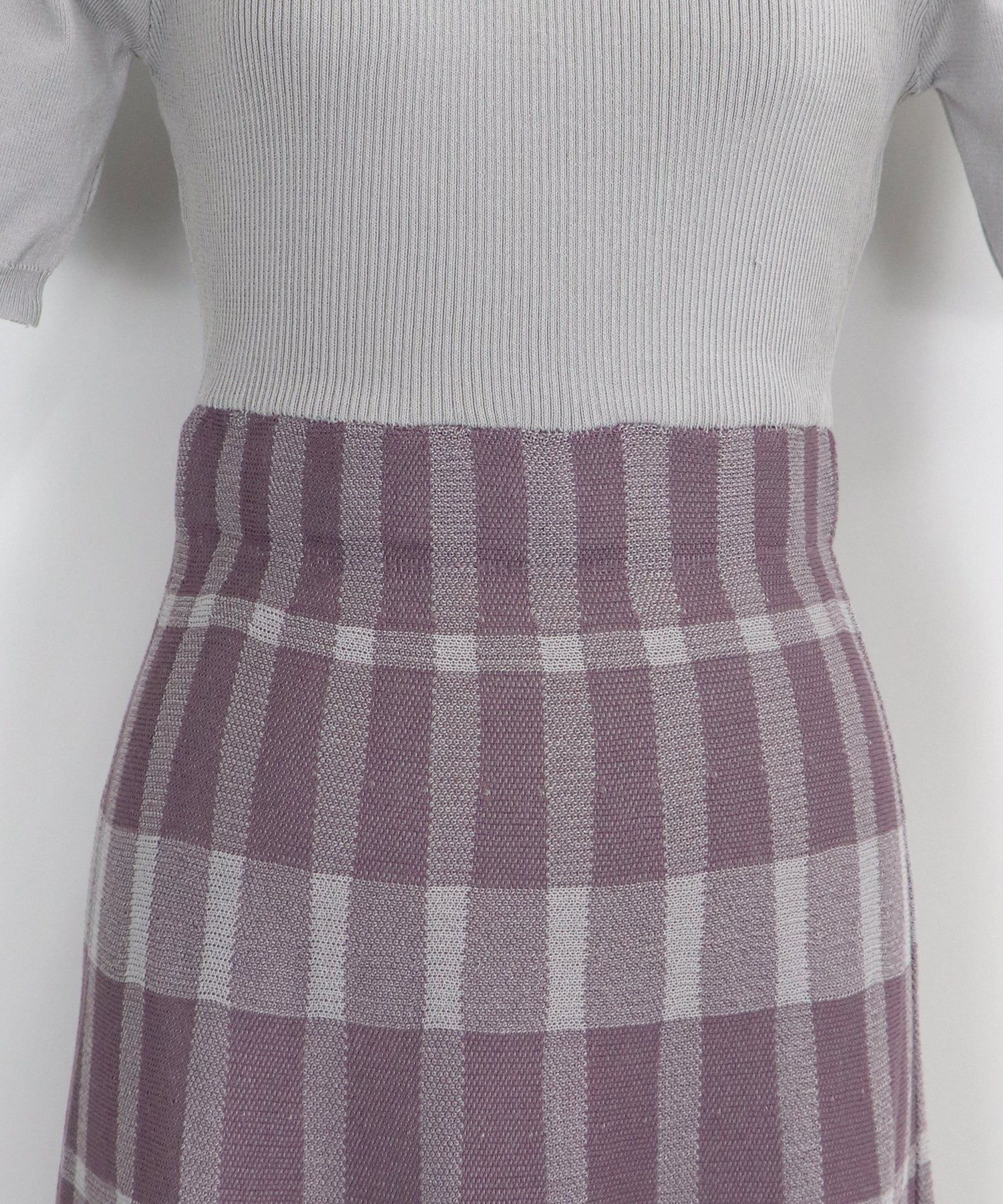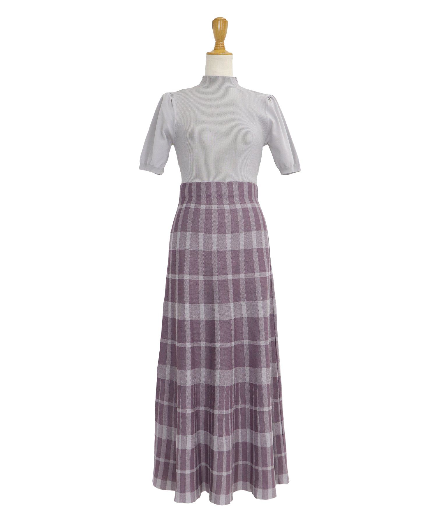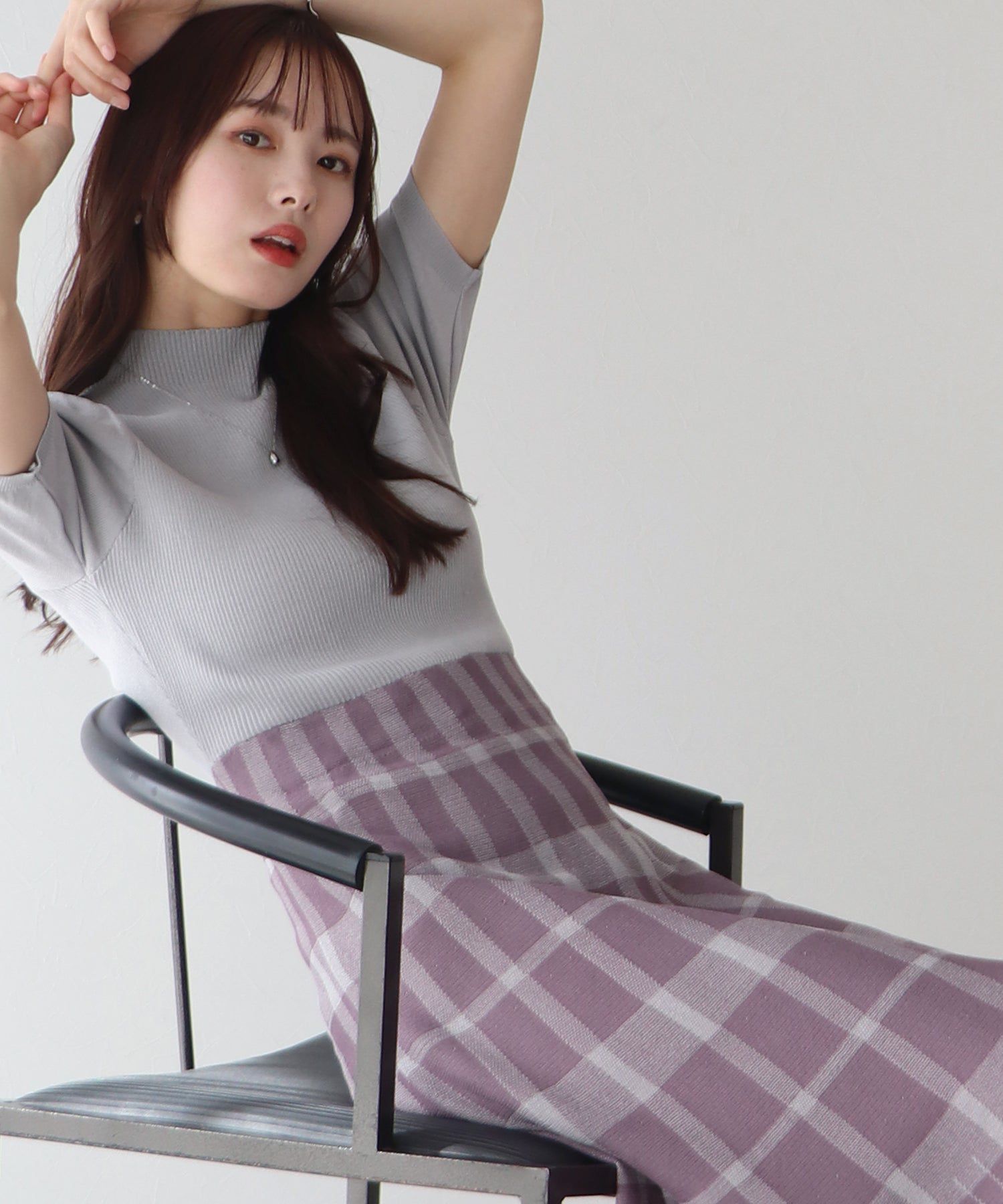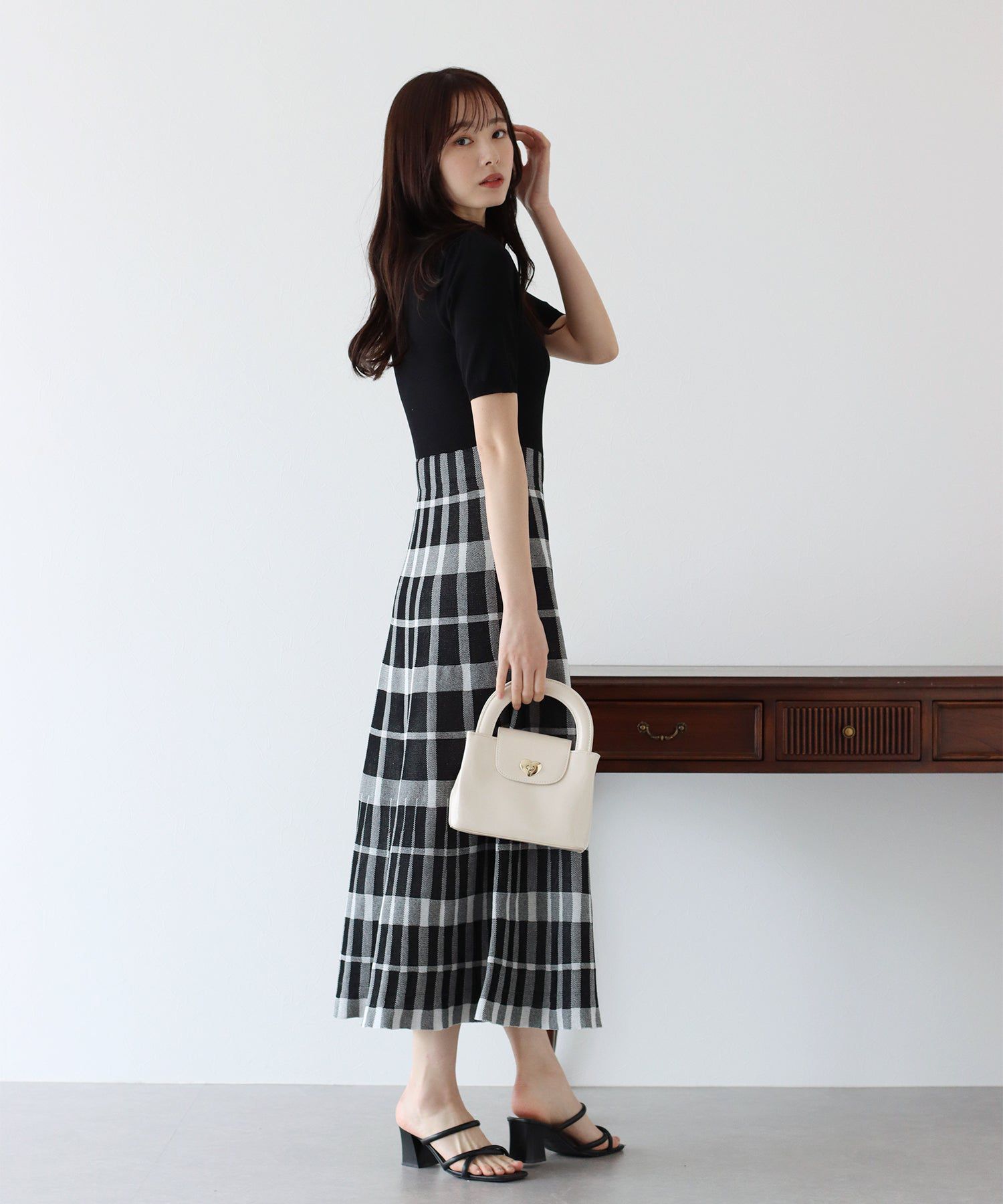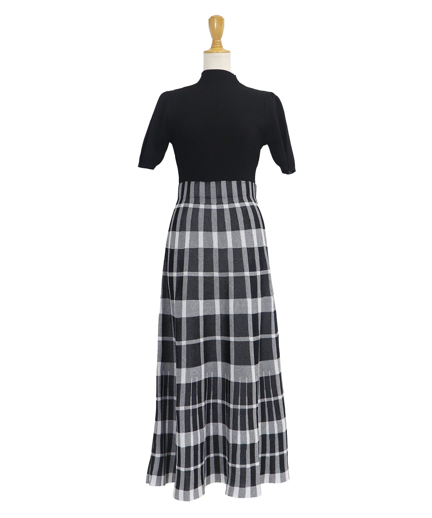 日本 BLUE EAST - 優雅高腰針織短袖洋裝-格紋-卡其