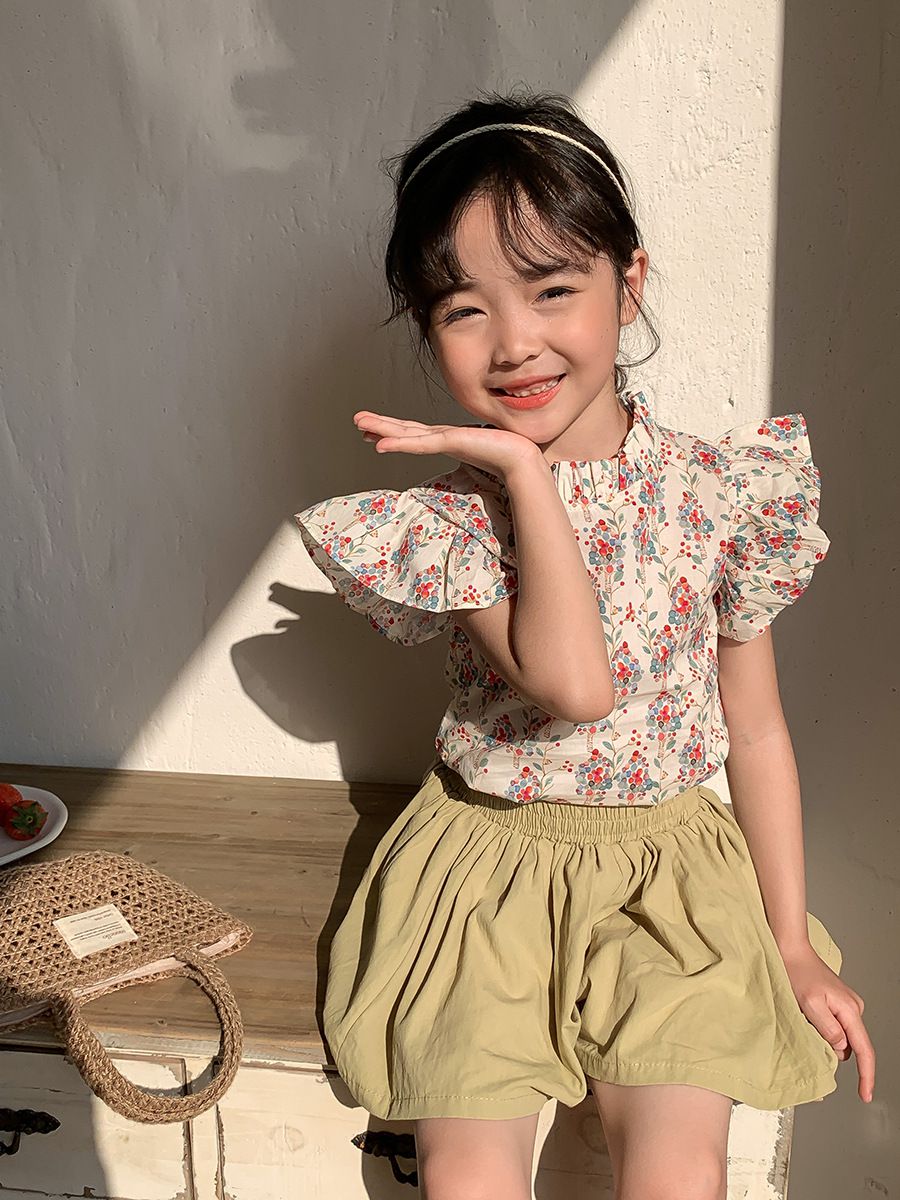 百搭小飛袖荷葉領上衣-紫黃小花朵