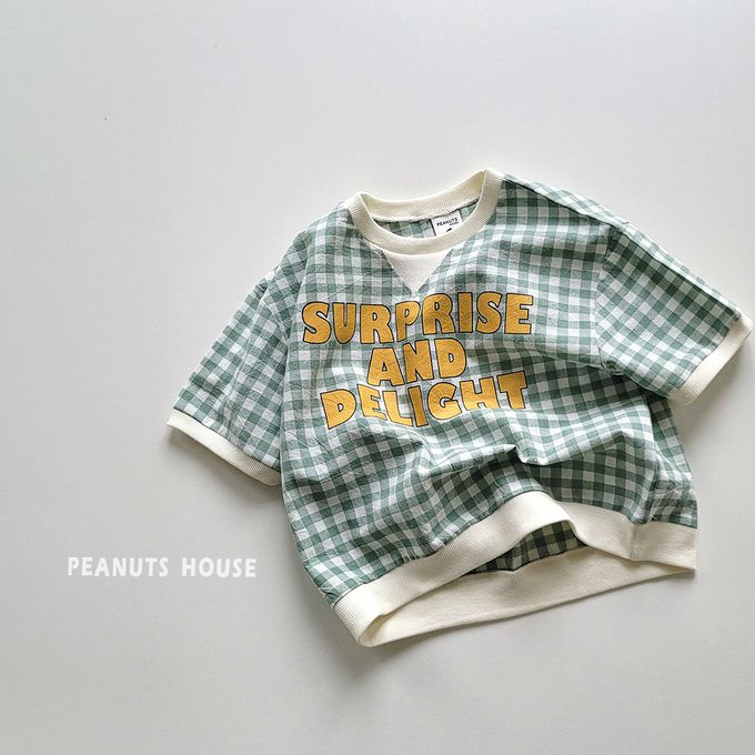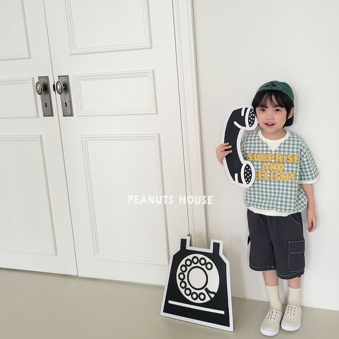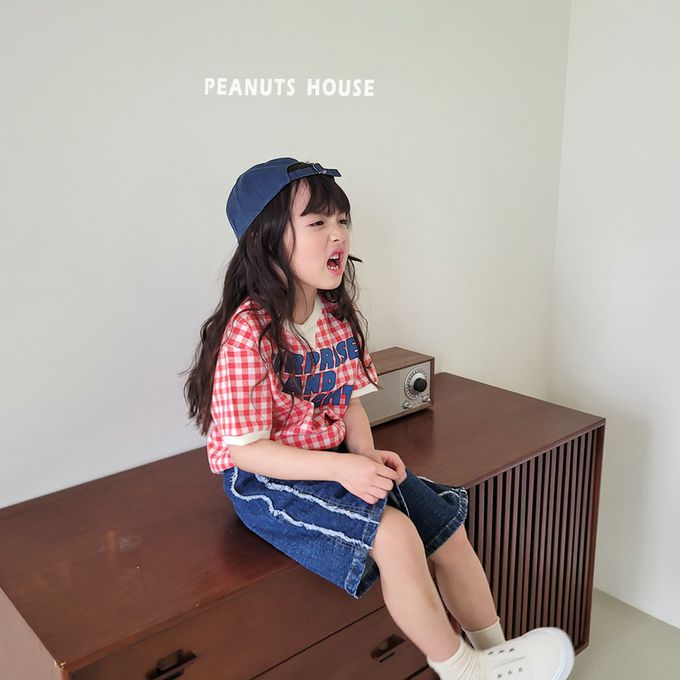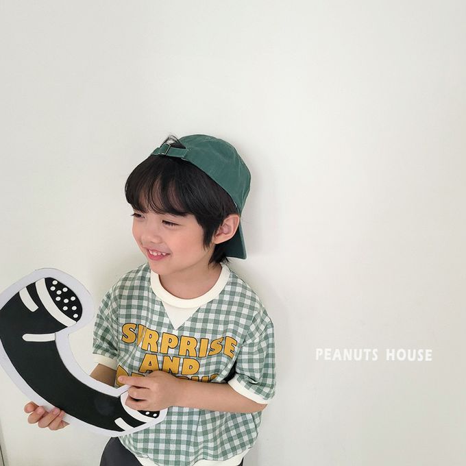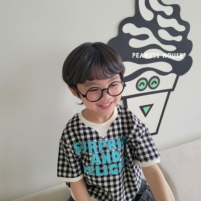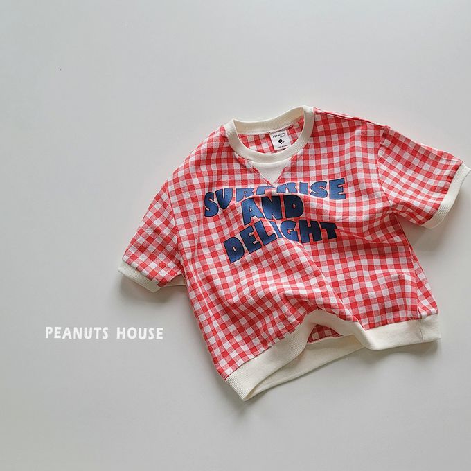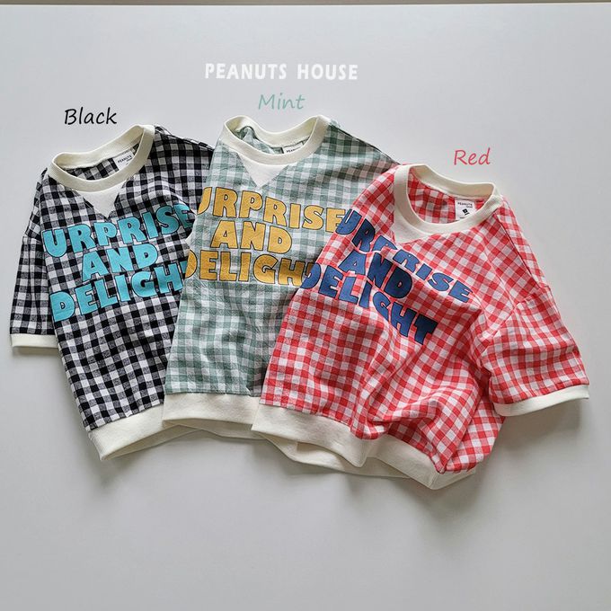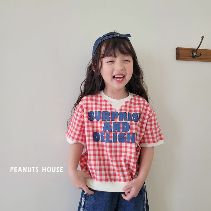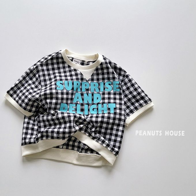 韓國 Peanuts House - 文字格子印短袖上衣-黑