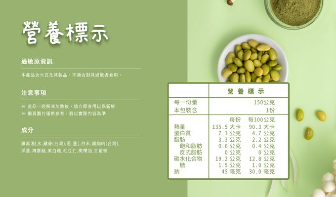 過敏原:本產品含大豆及其製品,不適合對其過敏者食用