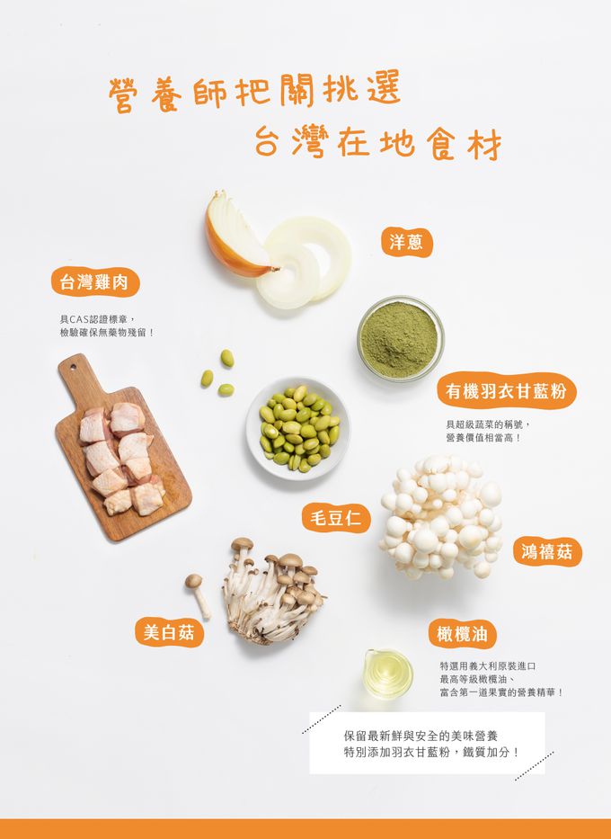 成分:雞高湯[水,雞骨(台灣),蔥,薑],白米,雞胸肉(台灣),洋蔥,鴻喜菇,美白菇,毛豆仁,橄欖油,甘藍粉
