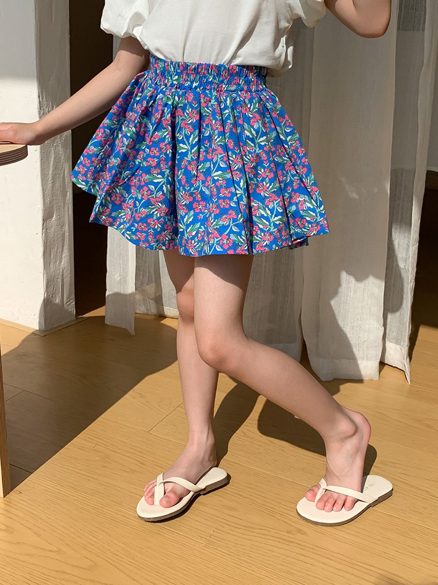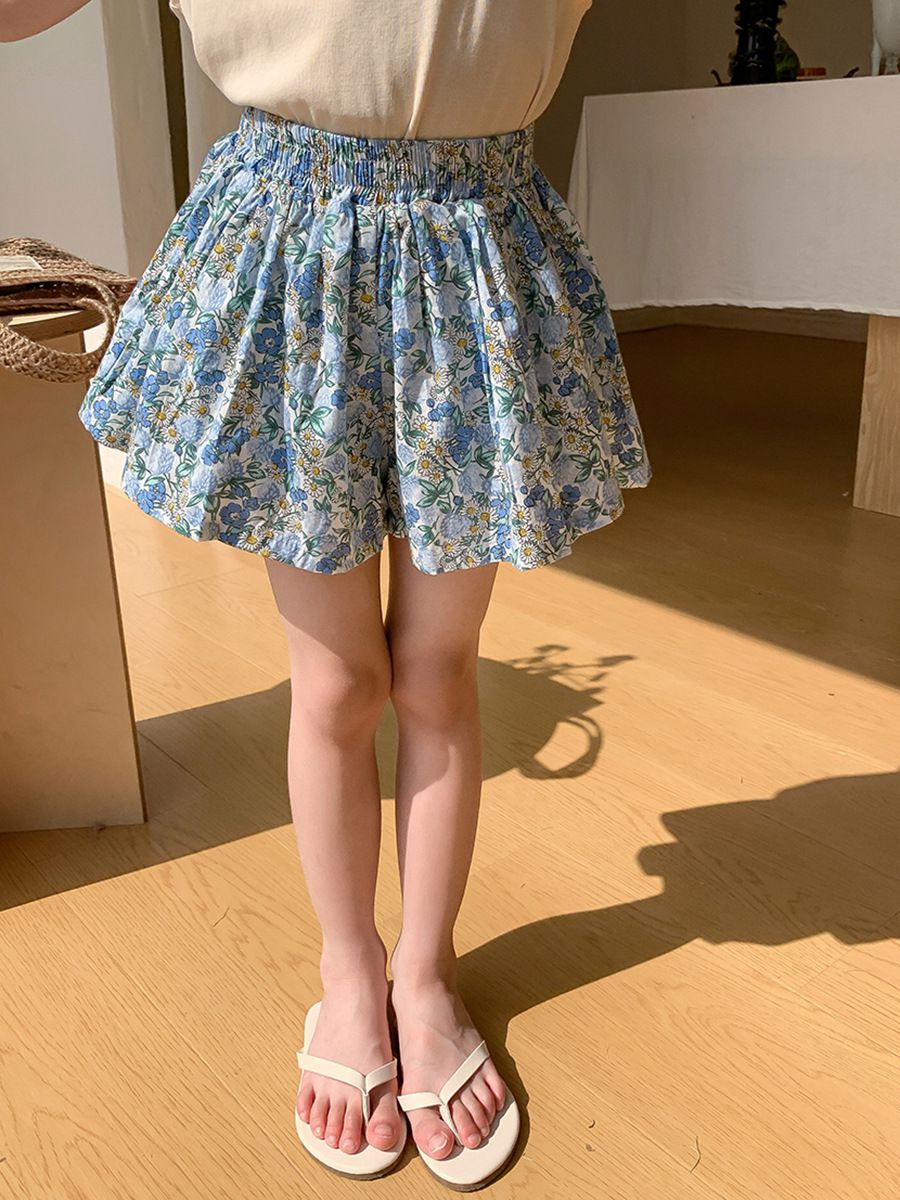 腰鬆緊小清新碎花短褲-繽紛繁花-藍+粉