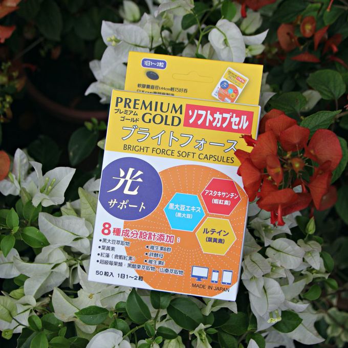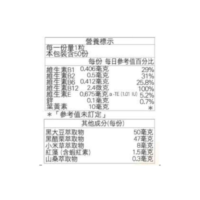 4. 專利黑大豆萃取(含高品質花青素、原花青素(花青素>10%與原花青素75%、矢車菊-3-葡萄糖(Cyanidin-3-Glucoside)成分),20%品牌葉黃素,紅藻萃取(含蝦紅素)。