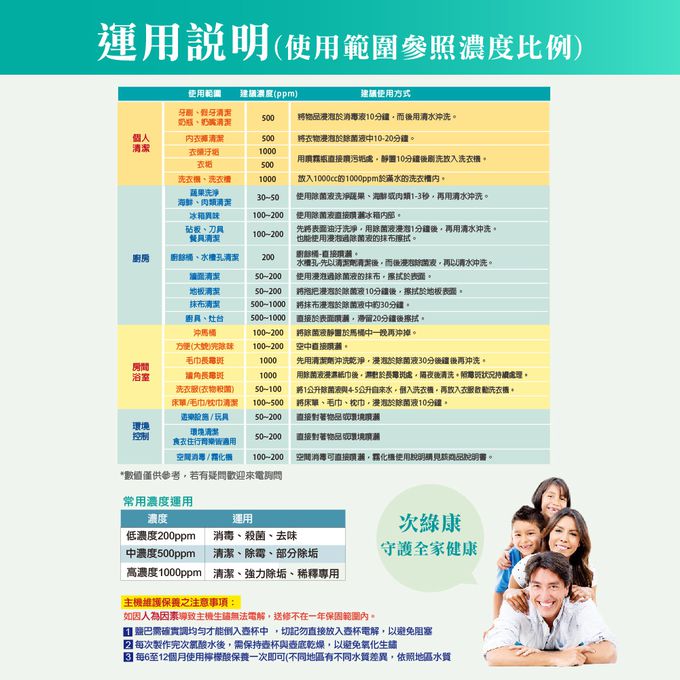 【使用方法】請參閱使用說明書,將食鹽及水加入杯中,依照所需濃度進行除菌液製造。