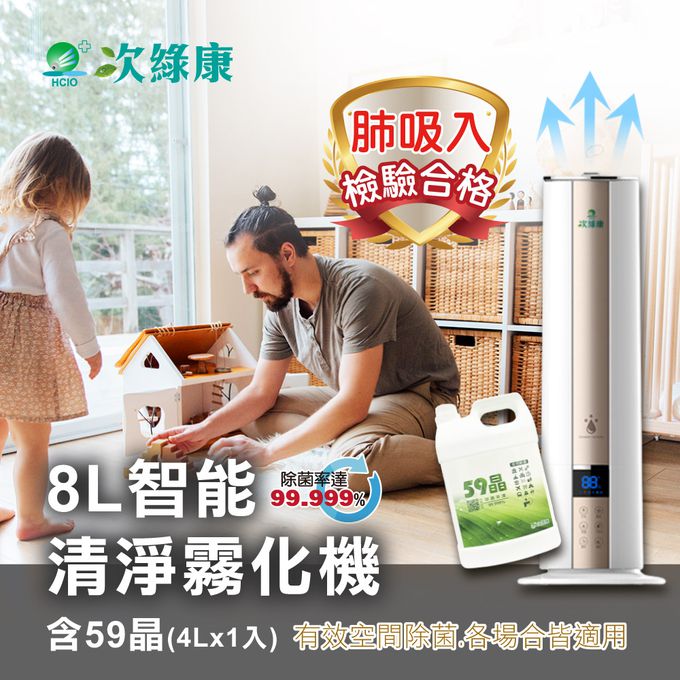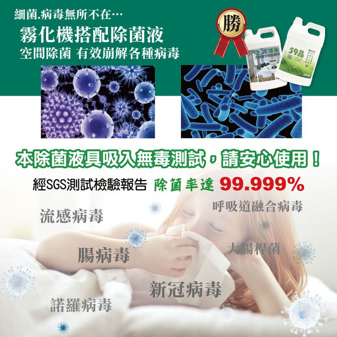 1.上蓋加入59晶除菌液,霧化機藉由高聲波轉化成細微的水分子散佈在空氣中