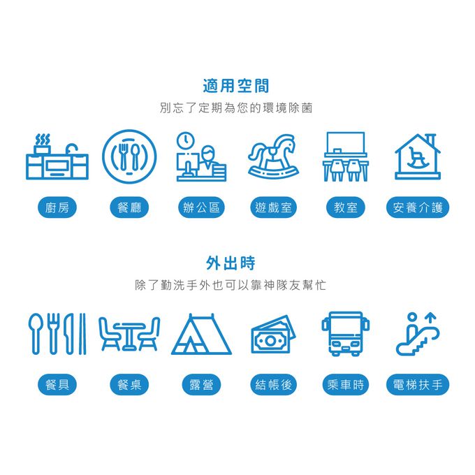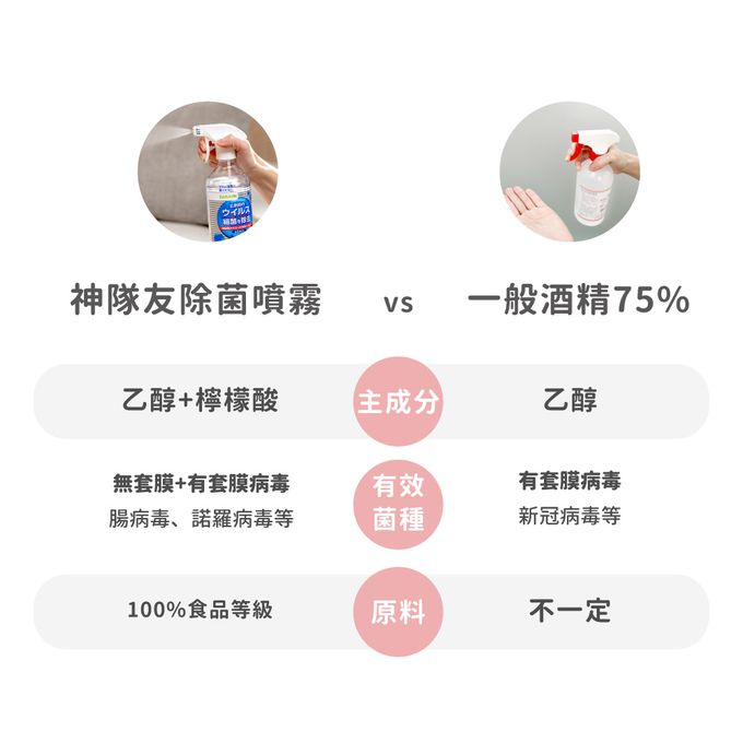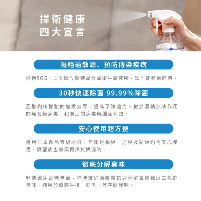 注意事項:1.不可食用,誤用於標示以外之用途。 2.勿朝臉部、傷口或敏感部位噴灑。 3.遠離火源。 4.使用時應維持良好通風。 5.請勿與其他化學品、清潔劑混合使用。 6.肌膚乾燥者使用時請戴手套。 7.液體碰到地板或家具時有變色之可能,請盡速以抹布擦拭。 8.請置於兒童不易取得處。 9.請放置於陰涼處,避免高溫與陽光直射。 10.請勿用於:蠟面或漆面、壓克力材質、木製家具與其他不適合接觸酒精之物品。