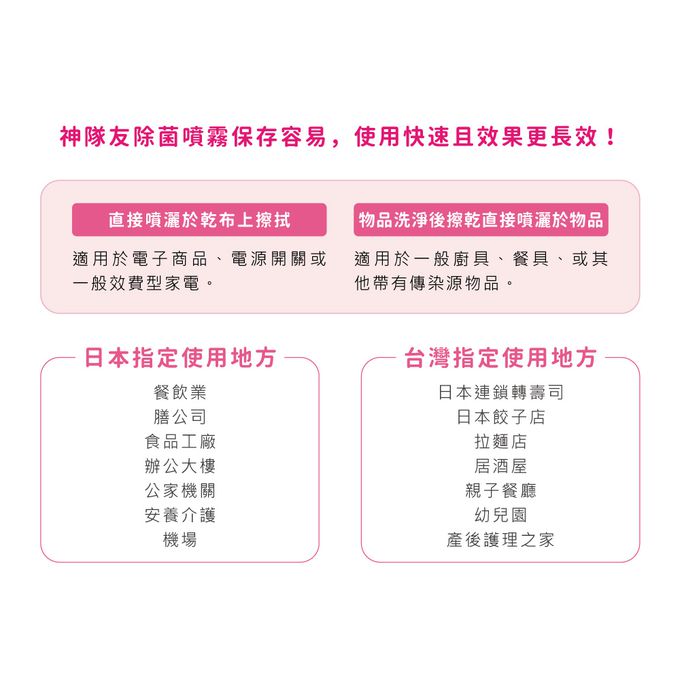 使用方式:直接噴灑後擦拭,無須再以水沖洗。