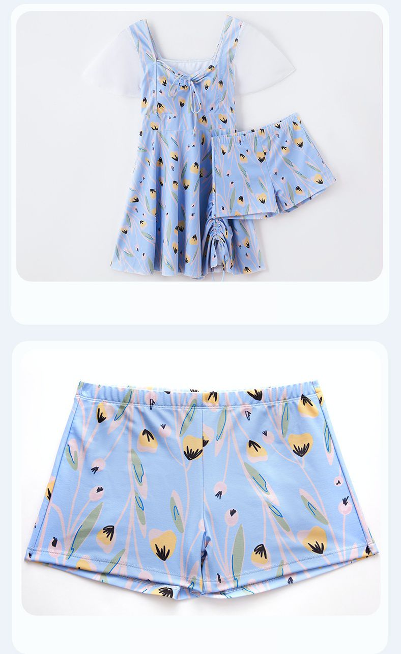 小清新下擺抽繩顯瘦連身裙泳衣-淺藍色